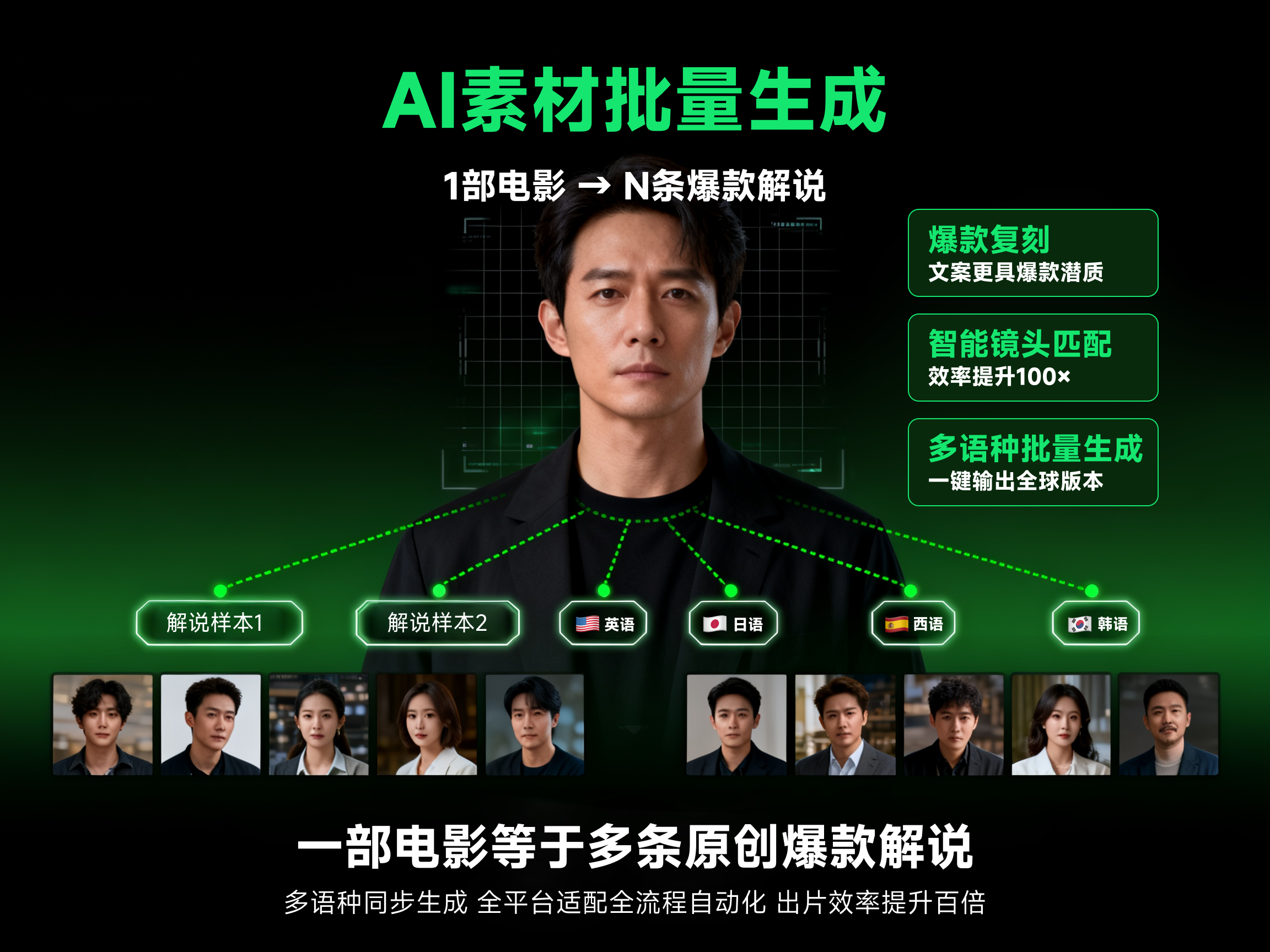 从“翻译”进化为“重写”: 输入电影素材(中文,外文电影均可),AI会利用大模型能力,识别目标市场的文化偏好(如美区的个人英雄主义、拉美区的家庭伦理),对解说文案进行本土化重构,而非生硬翻译。