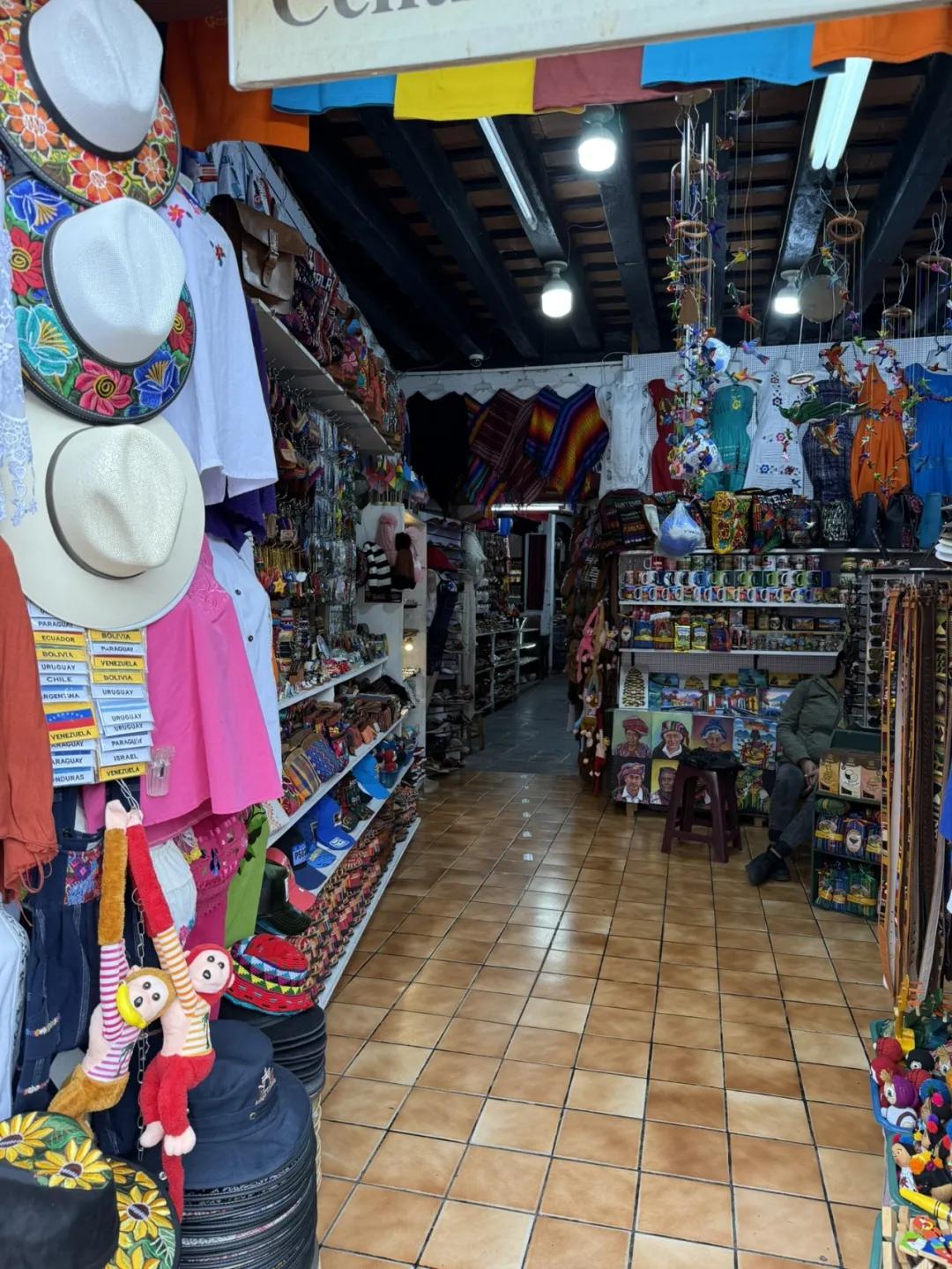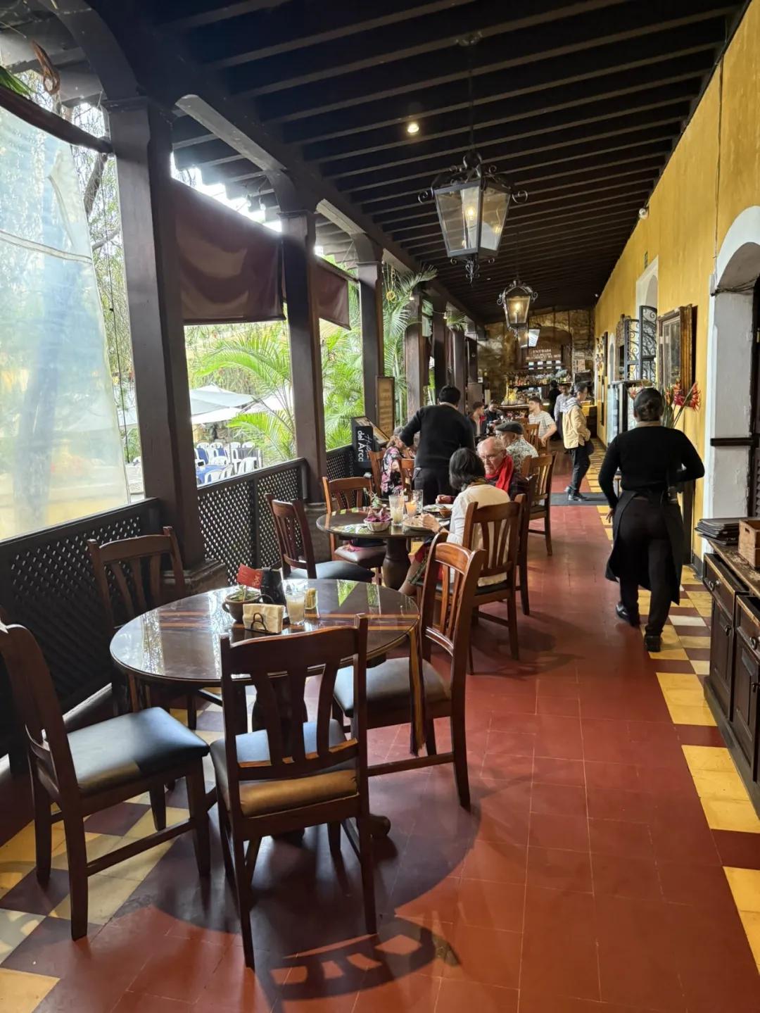 中央广场的西侧是老集市,集市外是南北走向的带顶棚的拱廊,这和西班牙很多中世纪的城市广场是一样的风格,这个拱廊俗称“面包师拱廊”,殖民时期,周边村庄的妇女会背着新鲜的面包来到这里售卖。为了抢占摊位,她们经常凌晨就守在拱廊下,这里因此得名。我们还进去看了看热闹,有许多餐厅和小商店,人气兴旺。