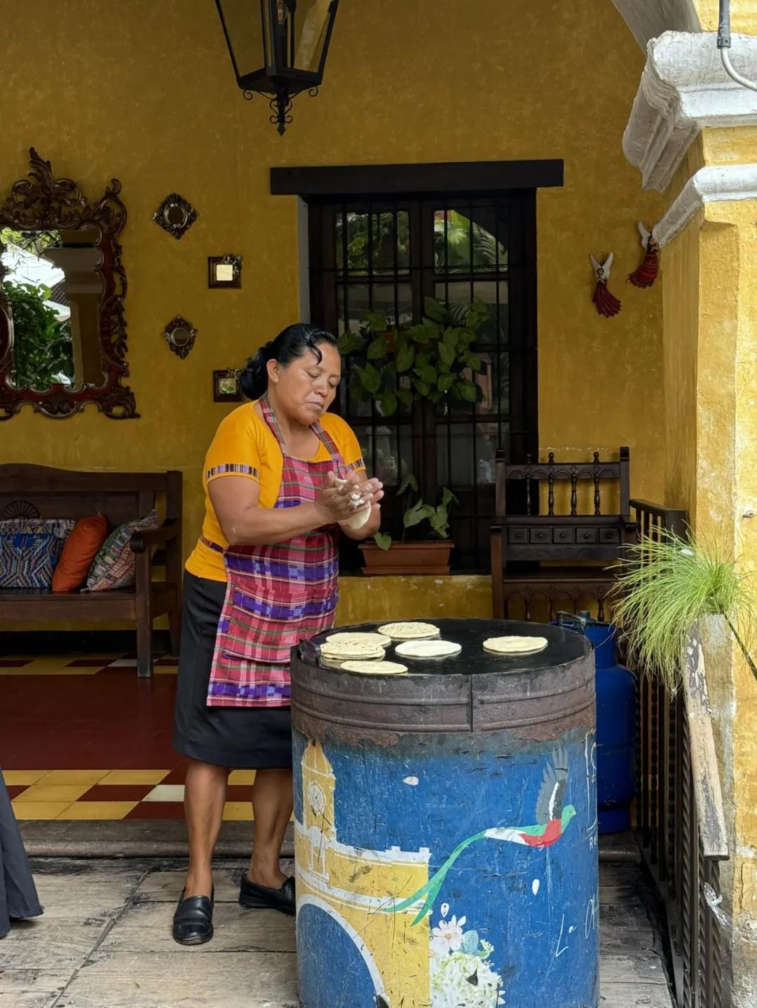 院子里有铁桶烤炉,一位中年玛雅人正在烤当地的玉米饼,神情专注,我们也每人点了一张。