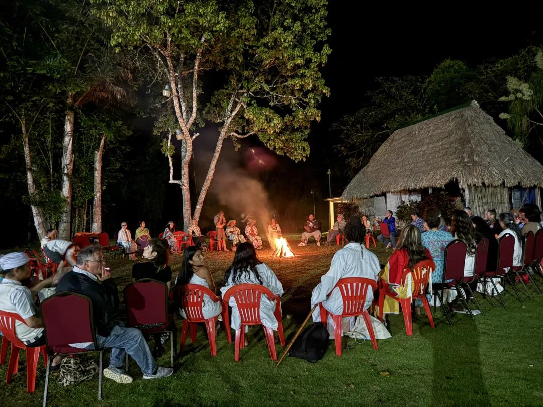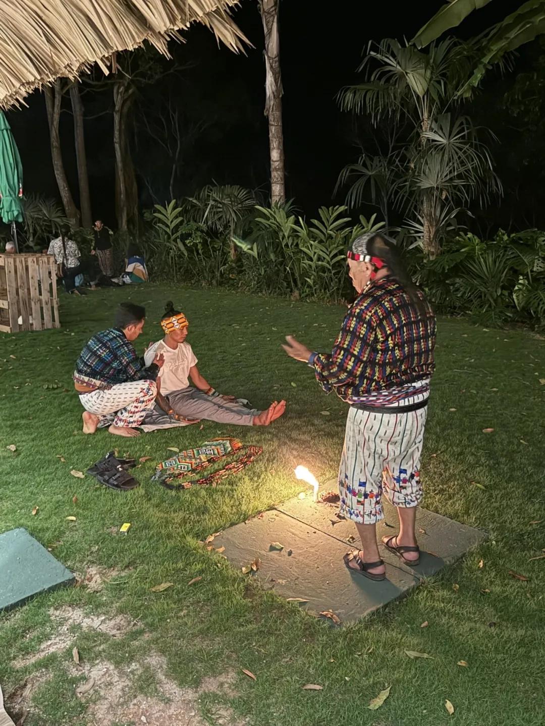 当晚放好行李,我出来转了转,看到有人在做按摩,但前面还站着一个老者,像是巫师在给做法事,气氛有点神秘。我很好奇并拿出了手机,刚要拍照,工作人员就示意我不要拍。这应该是当地的玛雅传统疗愈仪式。