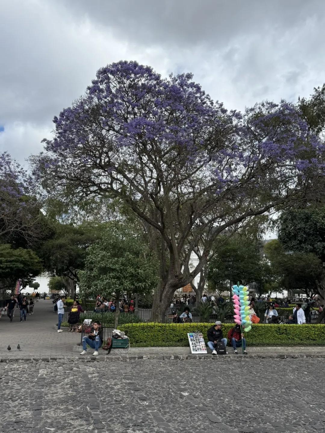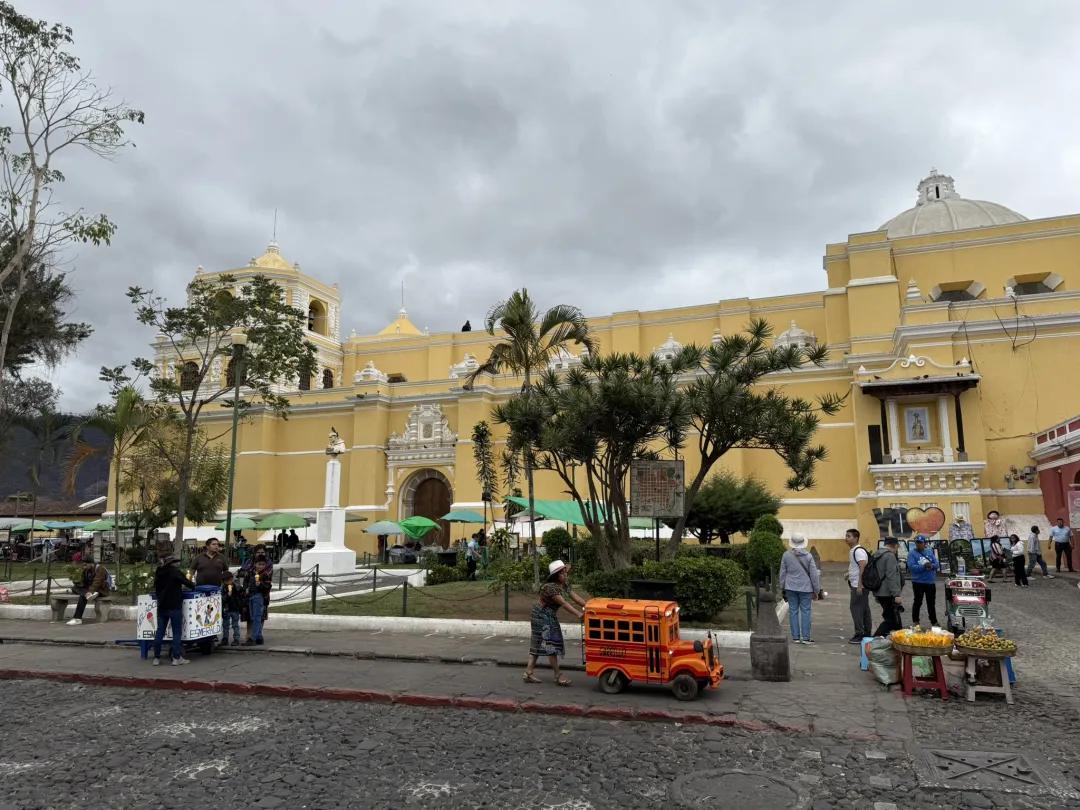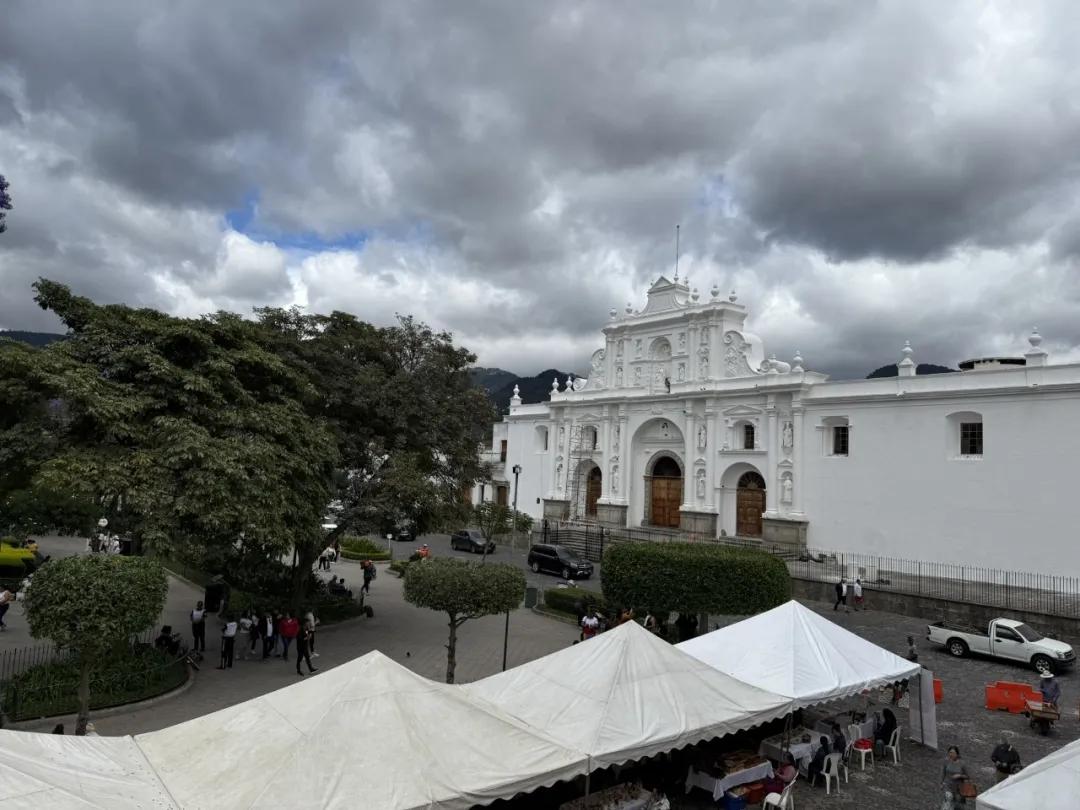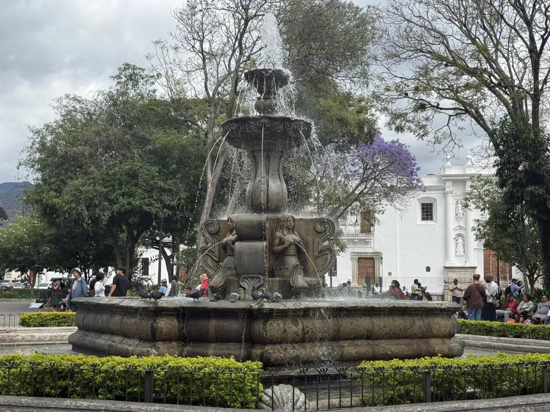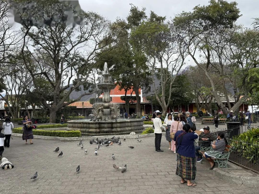 我们首先来到中央广场:广场并不显大,中间有一个圆形叠瀑喷泉水池,植被茂盛,有高大的蓝花楹;有一对新人在这里拍婚纱照,不少人在椅子上坐着,或走着;当时天气欠佳;东侧正对着的就是这座城市最核心的宗教建筑-圣荷西大教堂。它原本规模宏大,虽然在 1773 年地震中塌毁严重,但其雄伟的白色立面依然是广场的视觉中心。