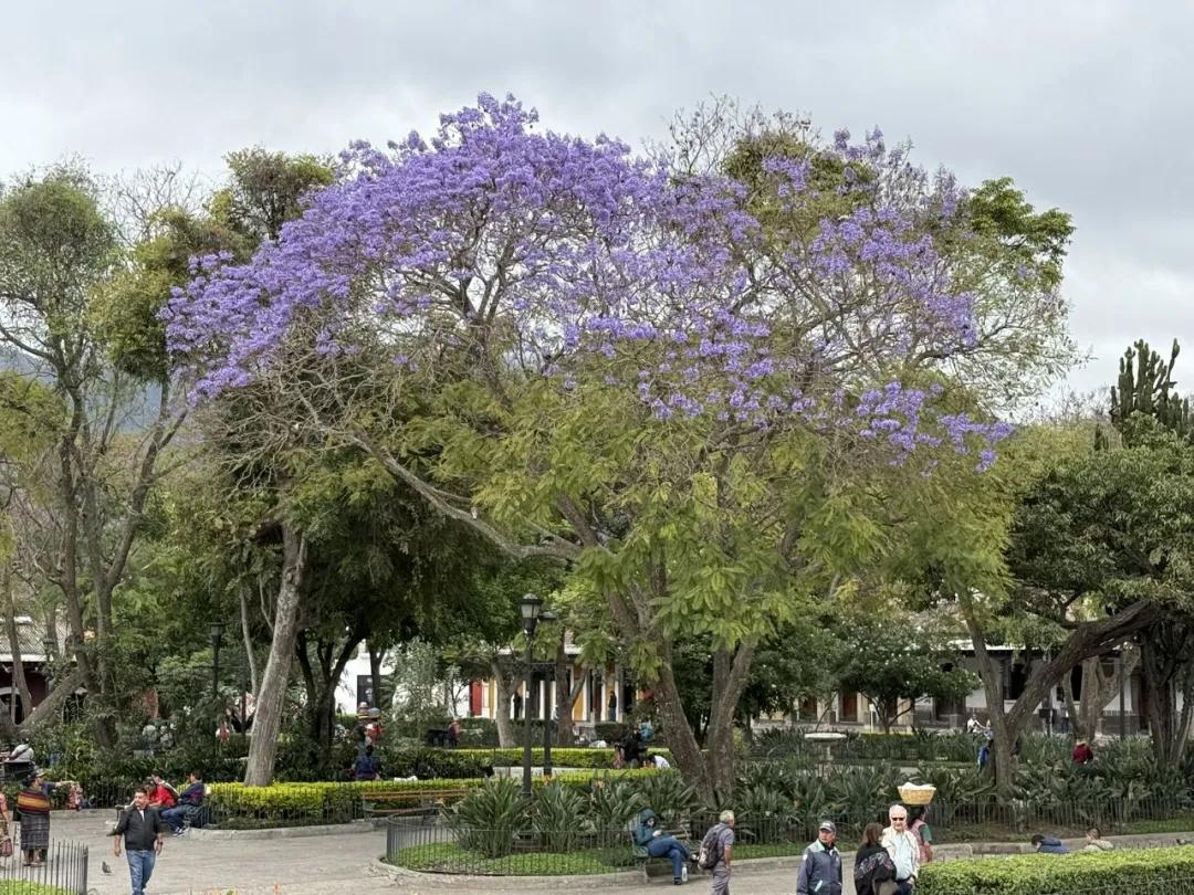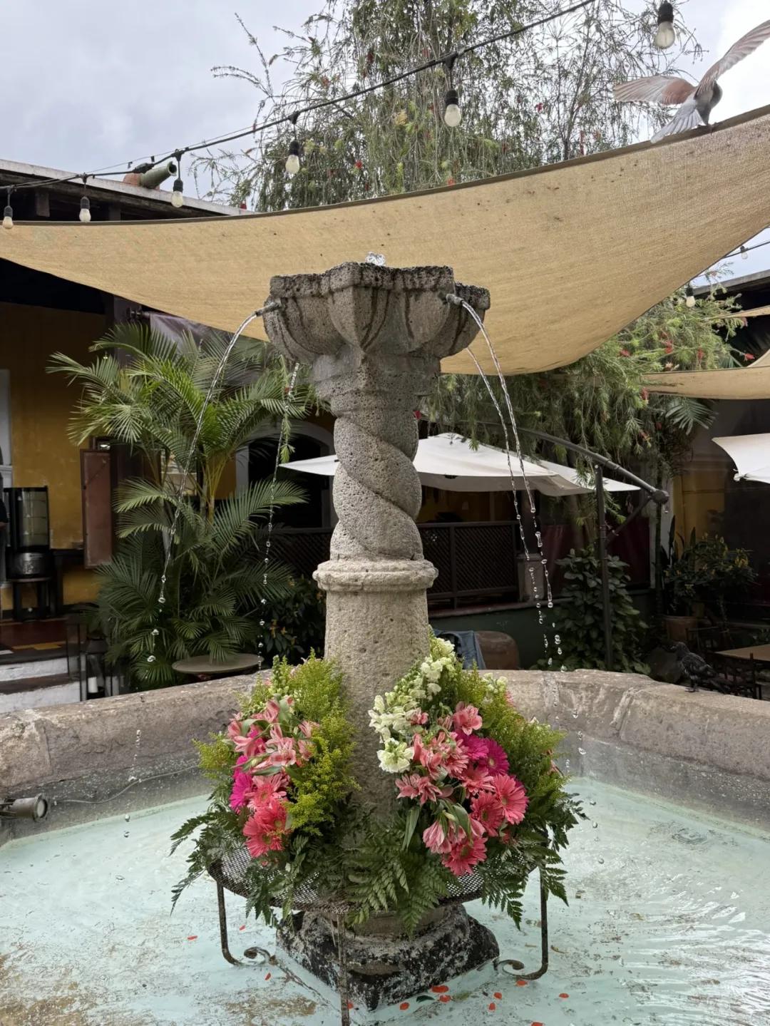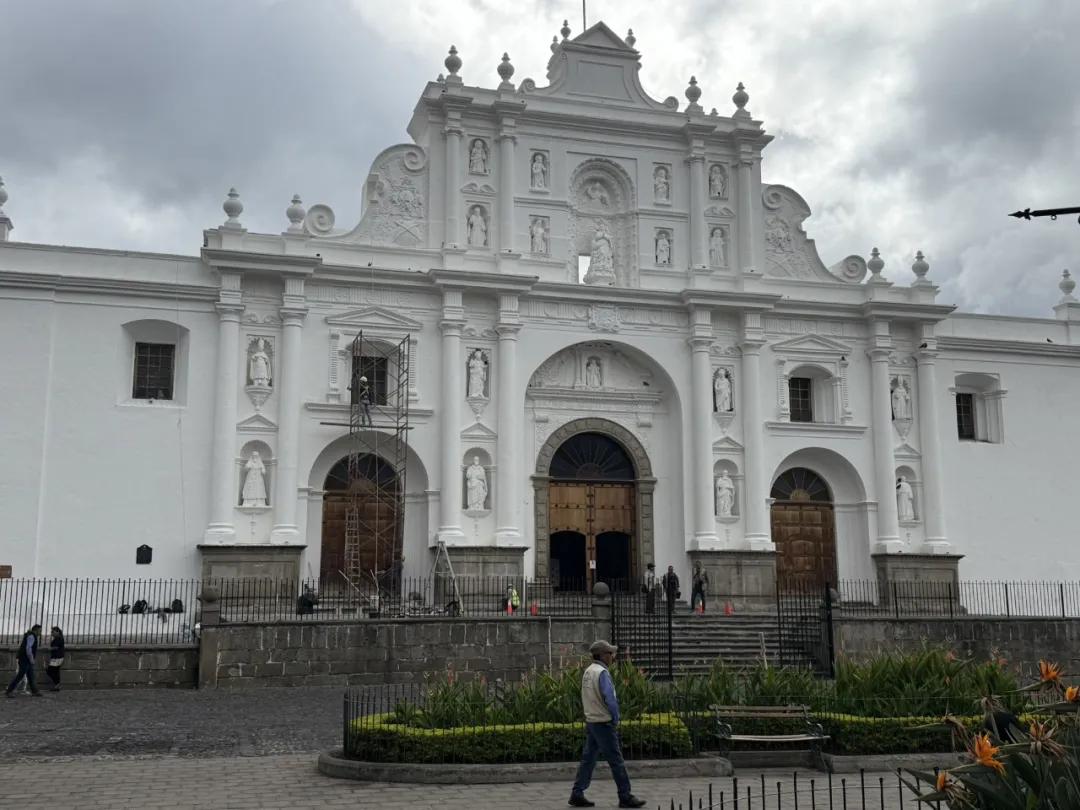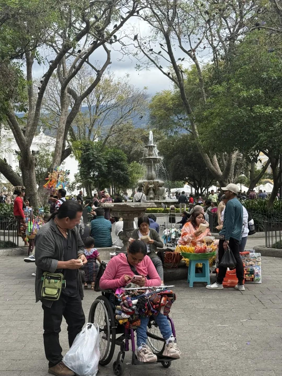 我们首先来到中央广场:广场并不显大,中间有一个圆形叠瀑喷泉水池,植被茂盛,有高大的蓝花楹;有一对新人在这里拍婚纱照,不少人在椅子上坐着,或走着;当时天气欠佳;东侧正对着的就是这座城市最核心的宗教建筑-圣荷西大教堂。它原本规模宏大,虽然在 1773 年地震中塌毁严重,但其雄伟的白色立面依然是广场的视觉中心。