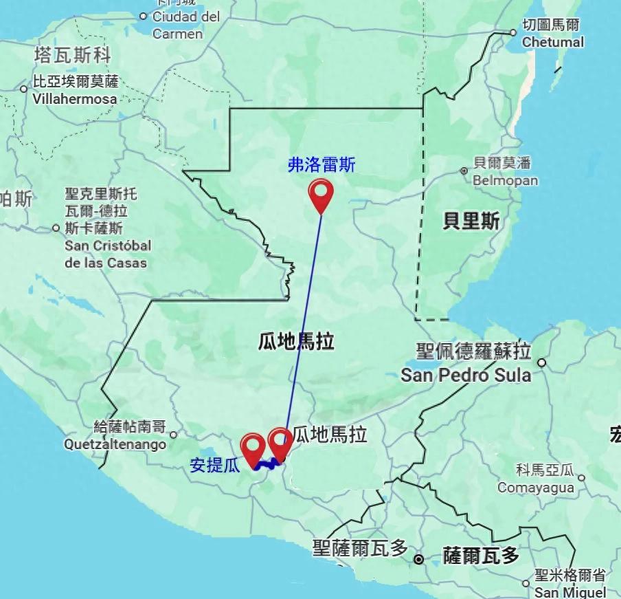 示意地图(安提瓜-瓜地马拉城✈️弗洛雷斯):