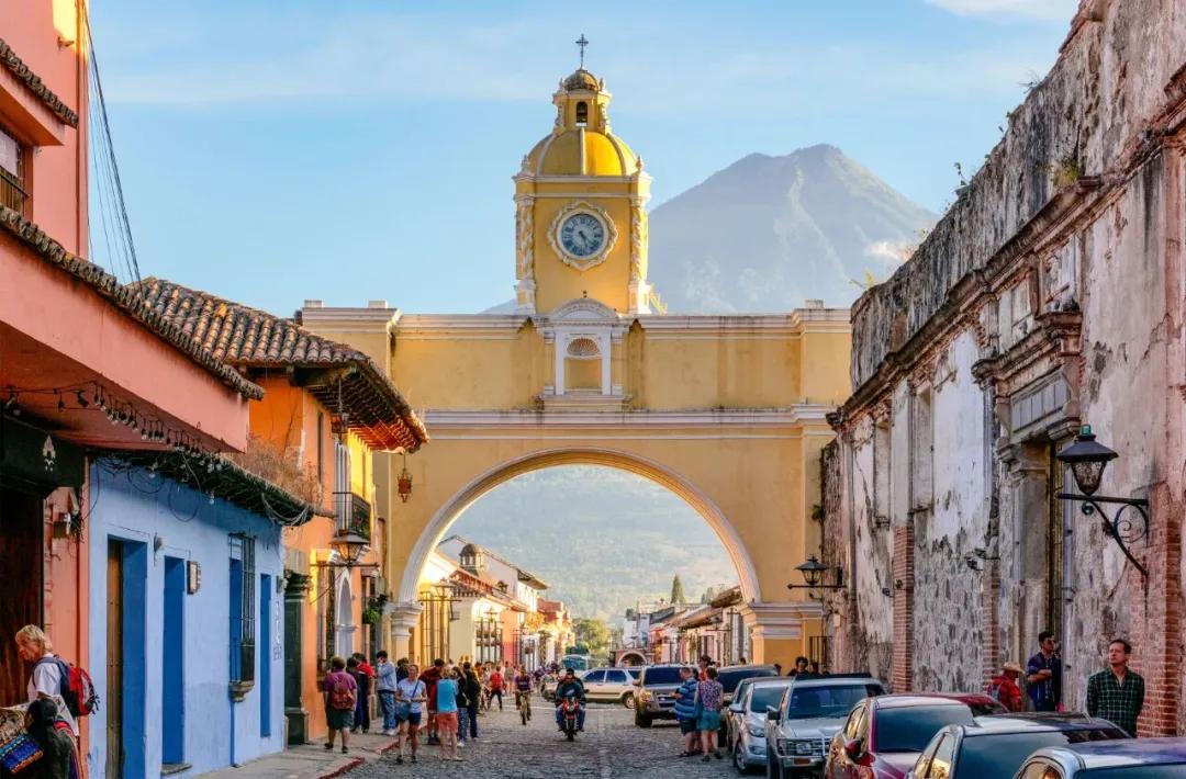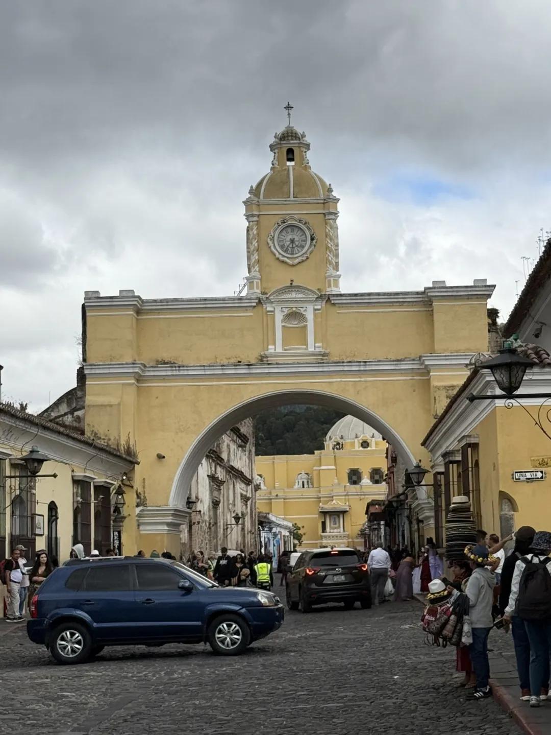 走不多远,眼前就出现了那个特别出彩的门,它就是安提瓜的地标——圣卡塔琳娜拱门,拱门上是一座桥,顶上还有一个精致的小钟楼。