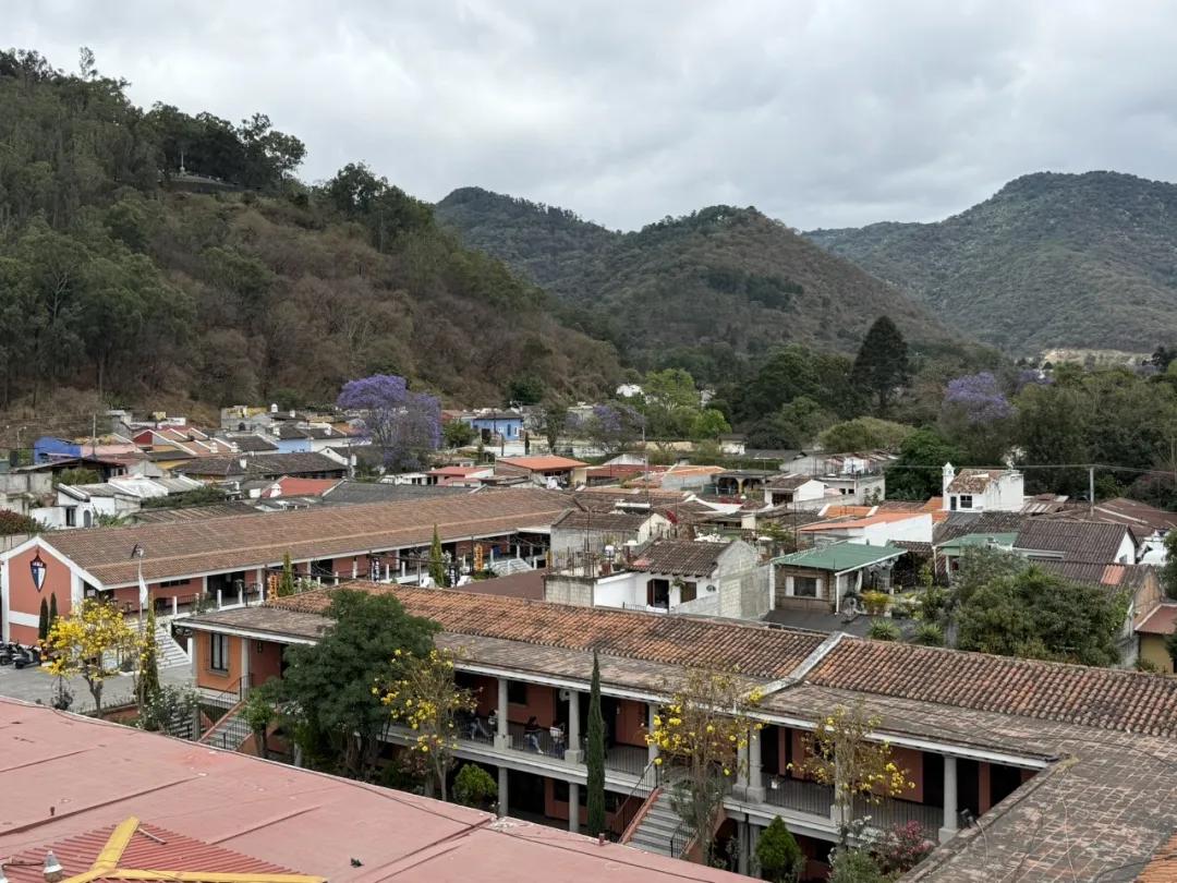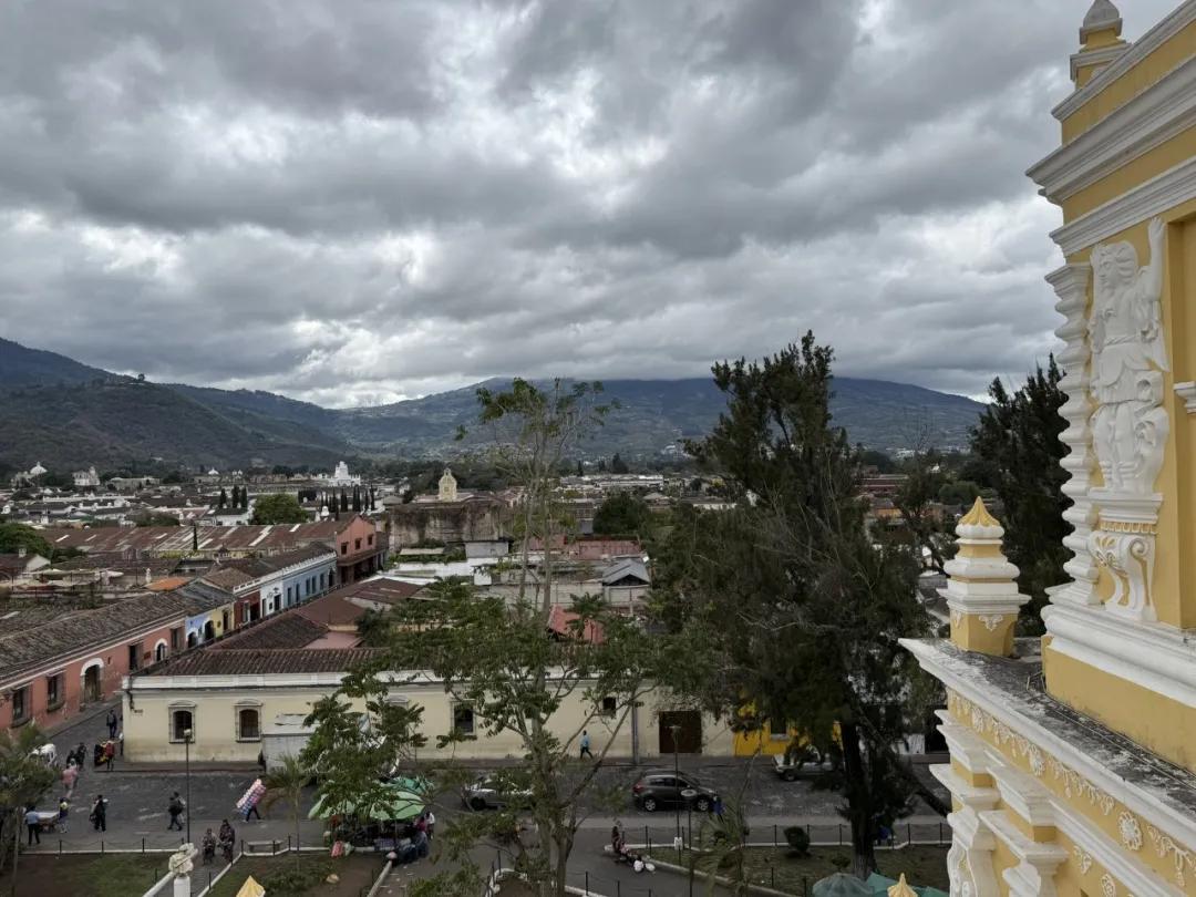 站在教堂屋顶,视野瞬间开阔。近处是一个个造型独特的圆形拱顶,这些低矮厚实的结构是当年为了防震而专门设计的,危地马拉确实是个多地震的地方。放眼望去,成片的黄色屋顶错落有致,这里是俯瞰全城的最佳视角;就在眼前的三座火山:水火山、火火山、阿卡特南戈火山也都清晰可见。