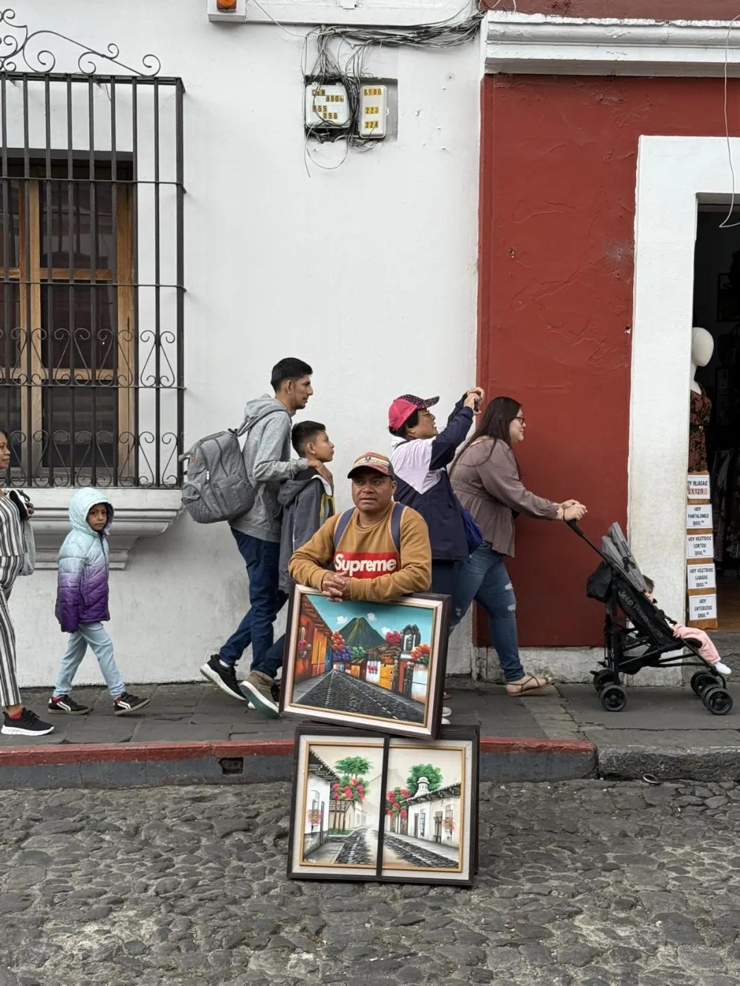 在这里活动大约1.5个小时,我们就沿着广场西北街的那条主街向北去,那条街就是安提瓜最著名的第五大道。这条街道是安提瓜最繁华、也是保存最完好的街道之一,两旁全是矮小的殖民风格建筑,外墙粉刷成黄色或红色,地面则是磨得发亮的鹅卵石。有许多看上去很有格调的餐厅,再就是各种纪念品商店,还有人在卖画。