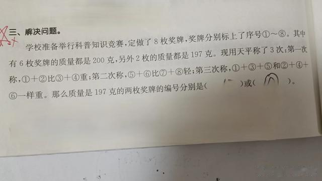 这是一道推理题。题目是:学校准备举行科普知识竞赛,定做了8枚奖牌,奖牌分别标上了序号①~⑧。其中有6枚奖牌的质量都是200克,另外2枚的质量都是197克。现用天平称了3次:第一次称,①+②比③+④重;第二次称,⑤+⑥比⑦+⑧轻;第三次称,①+③+⑤和②+④+⑥一样重。那么质量是197克的两枚奖牌的编号分别是()或()。