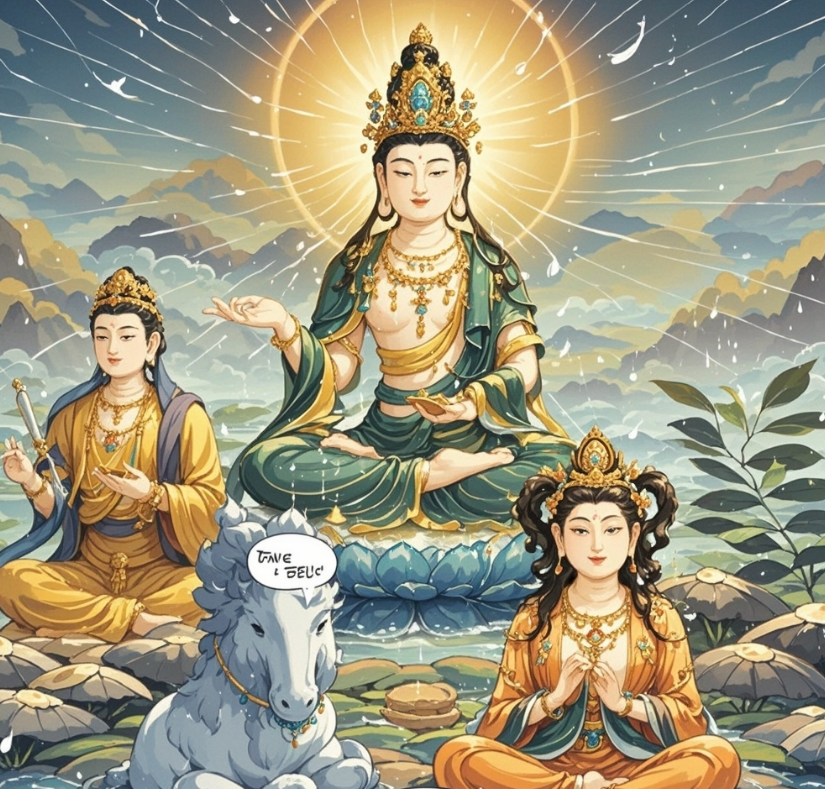 成为普贤菩萨后,他开始了自己的传奇之旅。他四处游历,传播佛法,帮助那些需要帮助的人们。在一个遭受旱灾的地区,土地干裂,庄稼枯萎,人们生活在极度的贫困之中。普贤菩萨看到这一切后,心中十分不忍。他决定运用自己的神力,为人们带来雨水。