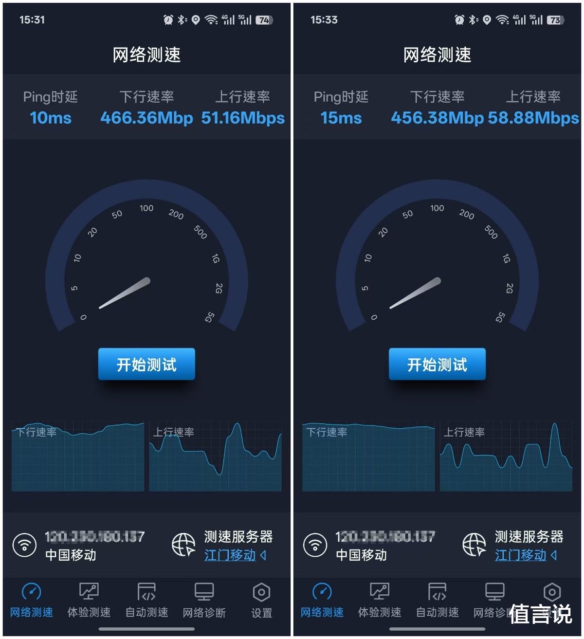 在另外一款测试软件中,母路由的下载速度为:466.36Mbps,上传速度:51.16Mbps,网络延时:10ms;子路由的下载速度为:456.38Mbps,上传速度:58.88Mbps,网络延时:15ms。