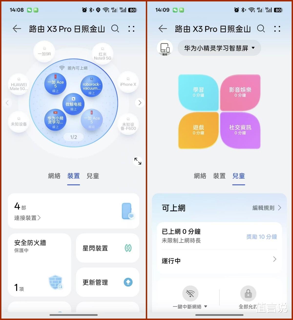 华为路由X3 Pro对于连接路由器Wi-Fi的智能设备管理,只需要通过简单的拖拽就可以实现连网权限操作,真的简单又便捷。其实,最喜欢的还是内置的儿童上网关怀功能,将孩子的学习平板拖拽到保护功能内,智能设备中的游戏、视频、社交、支付、安装应用和网址黑名单等应该功能,家长都可以进行精细化的管理,比如可以玩哪一款游戏,可以看哪一个视频APP等等。