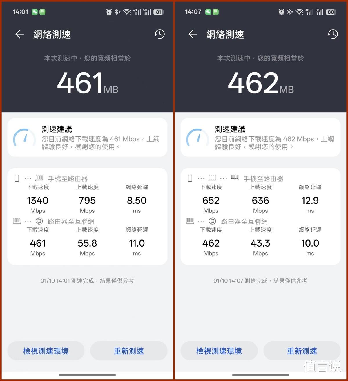 其中母路由的下载速度为:461Mbps,上传速度:55.8Mbps,网络延时:11ms;子路由的下载速度为:462Mbps,上传速度:43.3Mbps,网络延时:10ms。为了测试数据有可对比性,我还下载了另外一款测试软件继续进行测试。