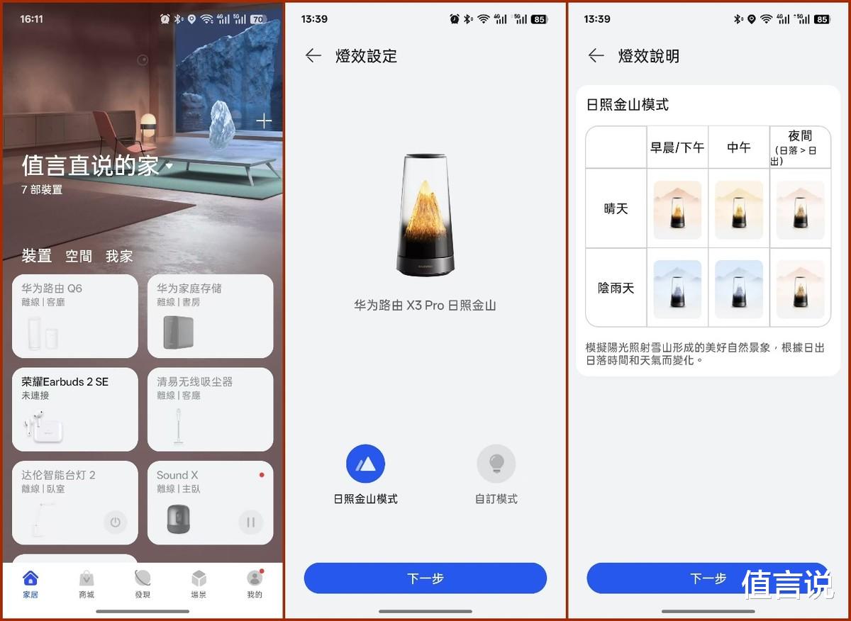 路由器的网络设置其实非常简单,打开”智慧生活“APP选择添加设备,就会自动进行扫描,添加成功后,由于微缩雪山内置了氛围灯系统,会有一个灯效设置选择和说明,大家可以根据需求进行设置,后期通过”智慧生活“APP也是可以自由调节的。