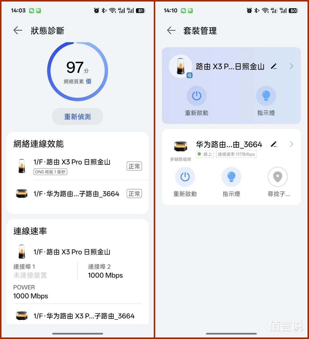 最后,在路由器Wi-Fi信号测试环节,首先使用”智慧生活“APP中提供的测网速功能,对子、母路由的Wi-Fi信号都进行了测试。