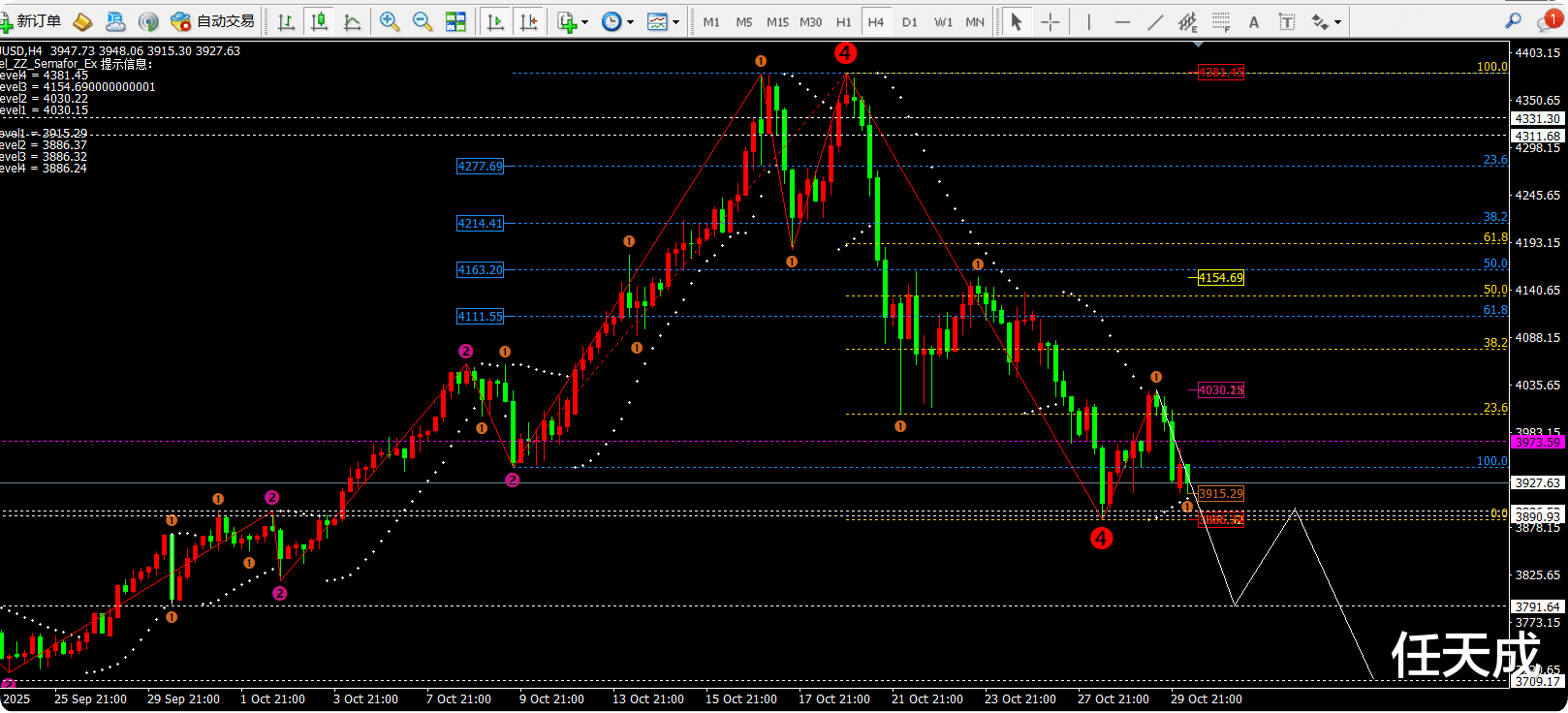 从4小时看做空点位于3955-57一线,但是因为小时线的弱势,所以做空点可能提前到3940附近。