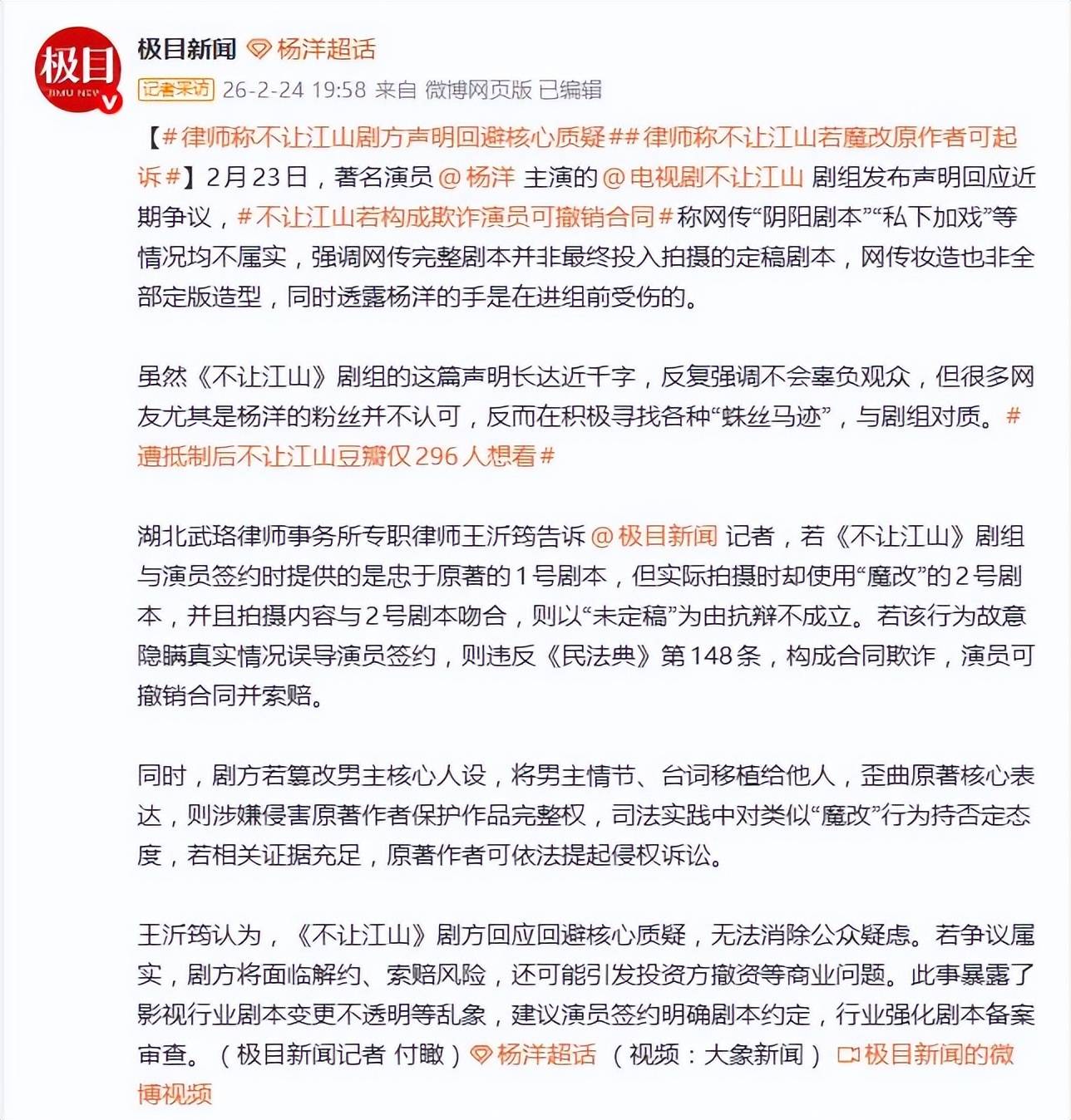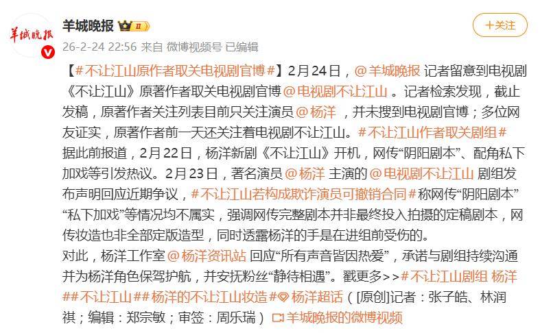 真正将事件推向高潮的,是原著作者知白的“反向操作”。开机当日,他曾积极关注官博及女主演,将社交头像改为“真好”,并早早进驻剧集超话,对杨洋出演男主公开表示认可。然而到了2月24日,网友发现其关注列表里只剩下了杨洋一人,官博与女主演均被移除。这一从“全力支持”到“切割撤资”般的态度急转,被广泛视为对剧本背离原著核心的无声抗议,比任何长篇声明都更具冲击力。