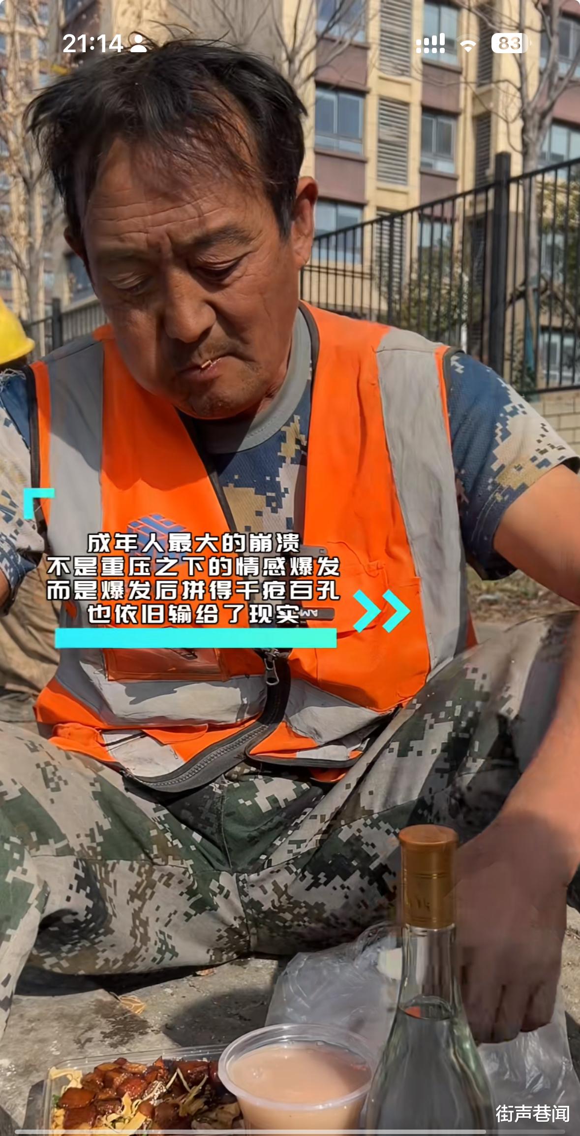 江苏徐州的一个工地角落,55岁的农民工大叔端着盒饭,正低头扒拉着里面的饭菜。