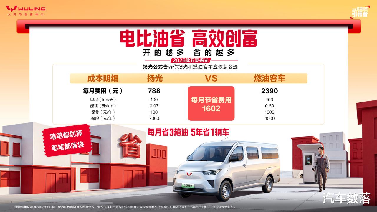 据测算,2026款五菱扬光每公里使用成本低至约0.07元,远低于同级油车每公里约0.69元的用车成本(按92#汽油8.6元/L计算)。假设司机每月行驶28天,每天行驶100km,驾驶扬光每月可比同级油车多省约1602元,相当于每月节省3箱油(以50L油箱为例),5年即可省出一台同级油车。