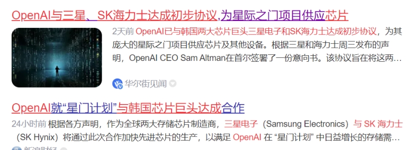 与此同时,OpenAI与三星、SK海力士达成初步协议,为星际之门项目供应芯片。据声明透露,随着星际之门项目在全球扩张,来自OpenAI的总需求可能达到每月90万片晶圆。SK集团在声明中强调,这一预测需求是当前全球高带宽存储器(HBM)产能的两倍多,凸显了项目的巨大体量和全球AI发展的迅猛势头。