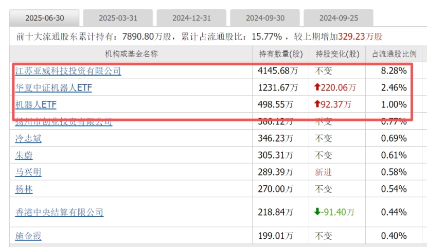 机构动态:二季度持股机构数37家,较一季度增加32家,合计持股7134万股,加仓884万股。前十大流通股东加仓329万股,其中两大机器人ETF加仓312万股,北上资金重仓218万股。