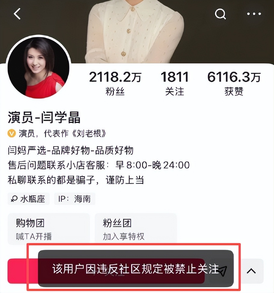 2026年1月10号起,她的抖音、快手等平台账号被标注“禁止关注”,新粉丝无法添加,短期内掉粉近20万。
