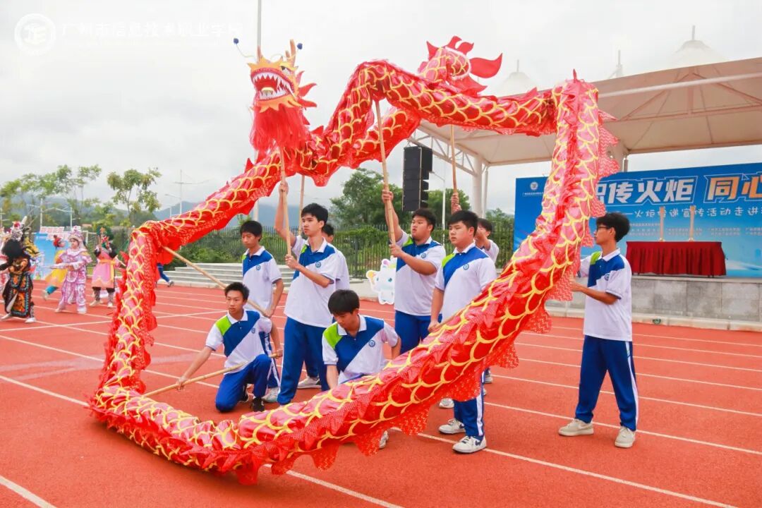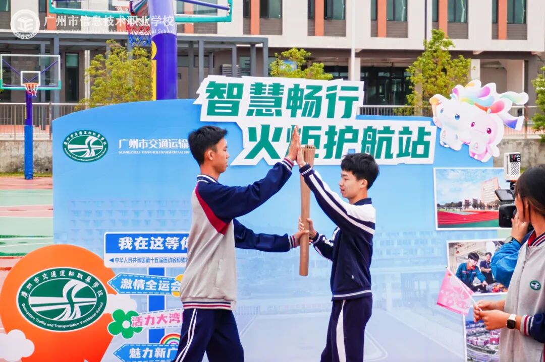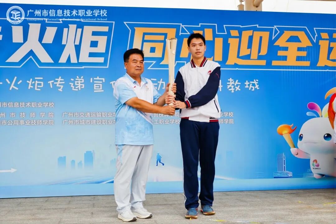 在象征性火炬传递环节,由胡伟京组长在“主火炬台”前将火炬交予广州市信息技术职业学校校长刘冠明,再由刘冠明校长将火炬交予学生火炬手。随后,来自9所职业院校的54名学生火炬手以整齐的三角队形行进,沿预定路线进行火炬接力分段传递,由最后一棒火炬手将火炬带回“主火炬台”完成所有传递环节。整个环节象征体育精神实现代际传承,并在新一代青年群体中传播与接续。