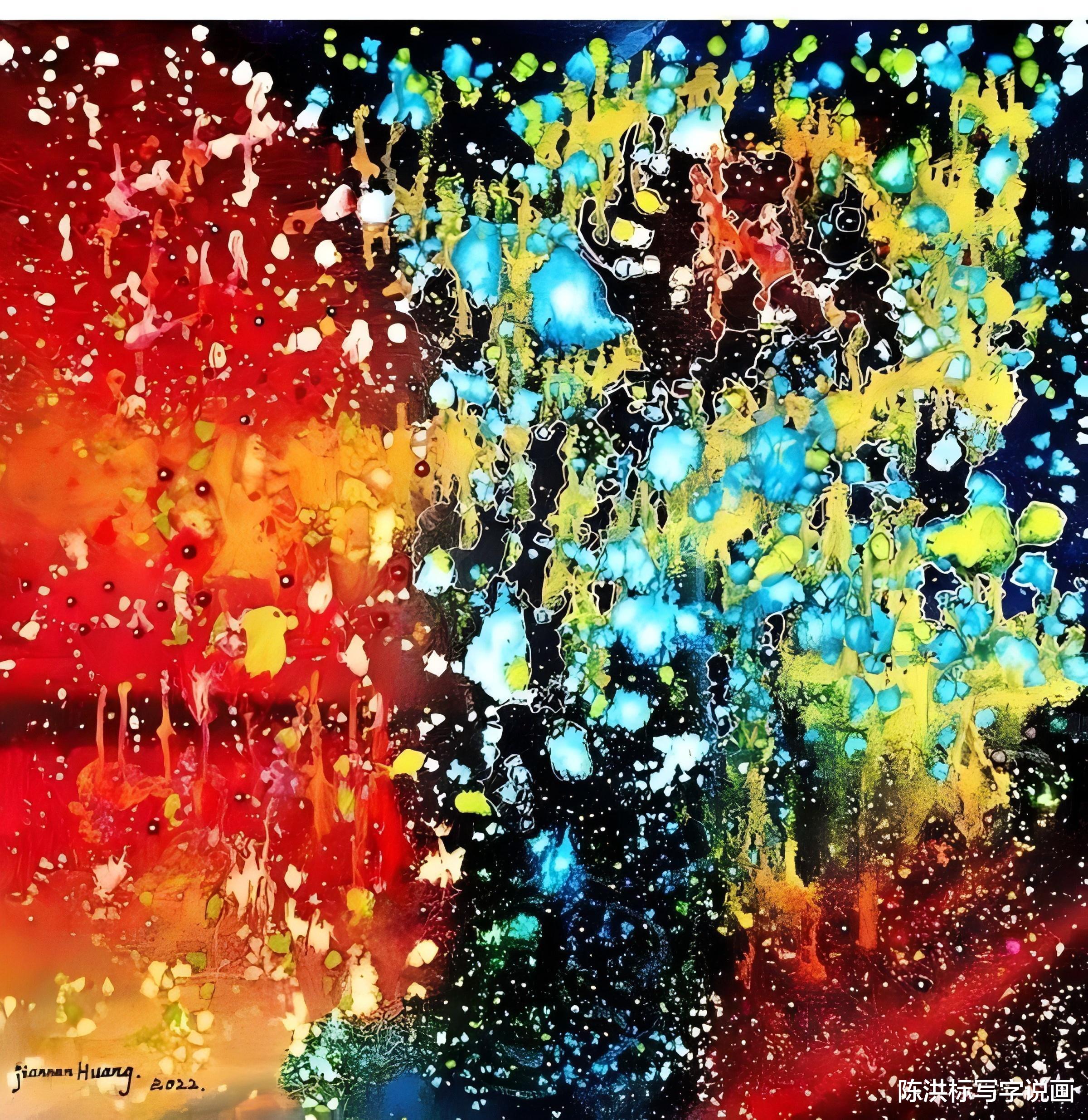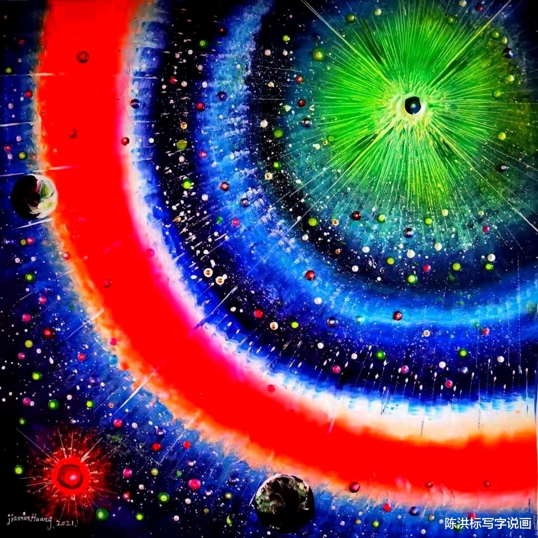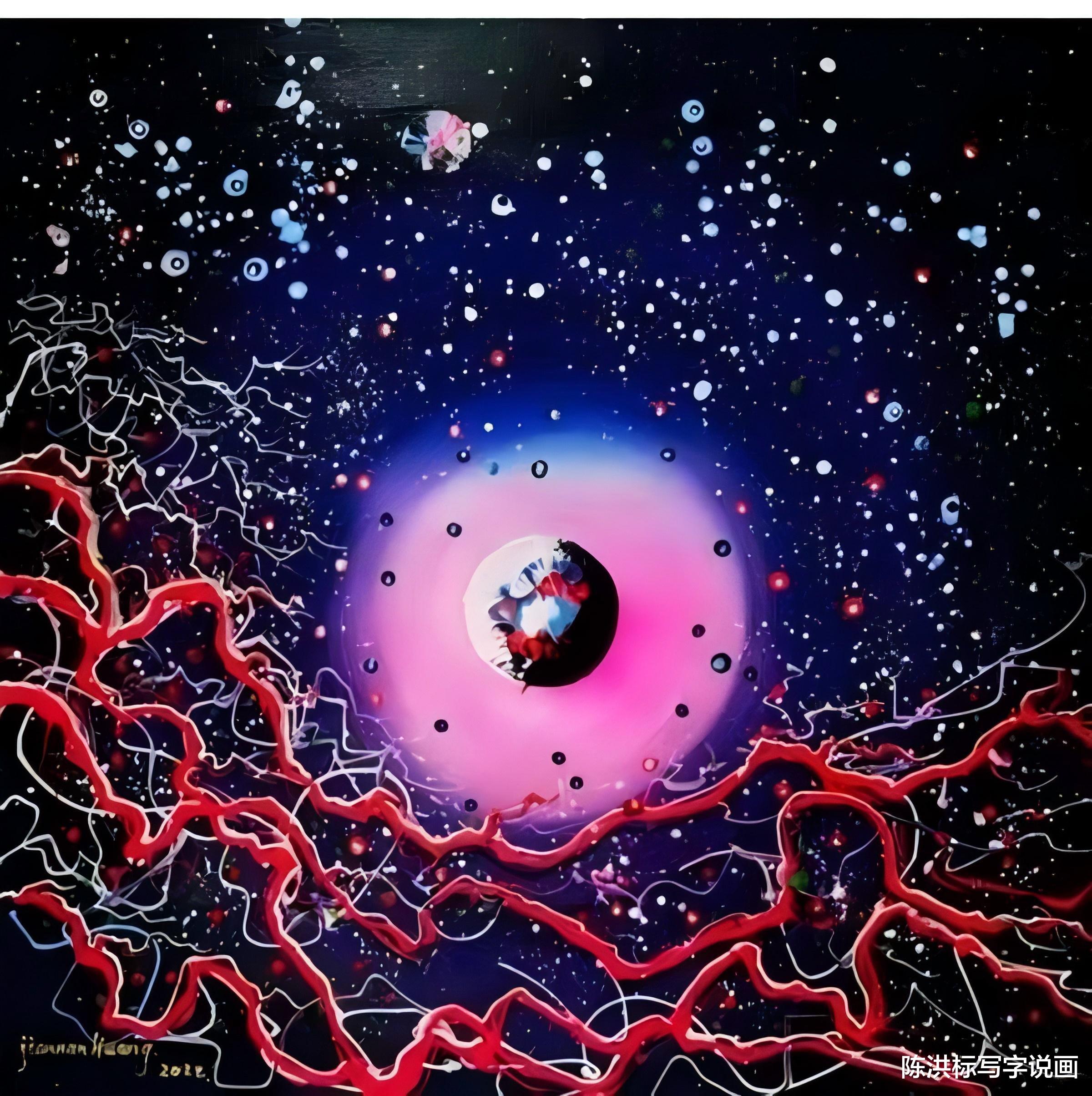 最后是后疫情时代的文化焦虑。黄建南作品中的宇宙主题,如《宇宙密码》《生命起源》《银河之外》等系列呼应了疫情后人类对生命本质的思考,被《纽约时报》解读为“疗愈性艺术”。