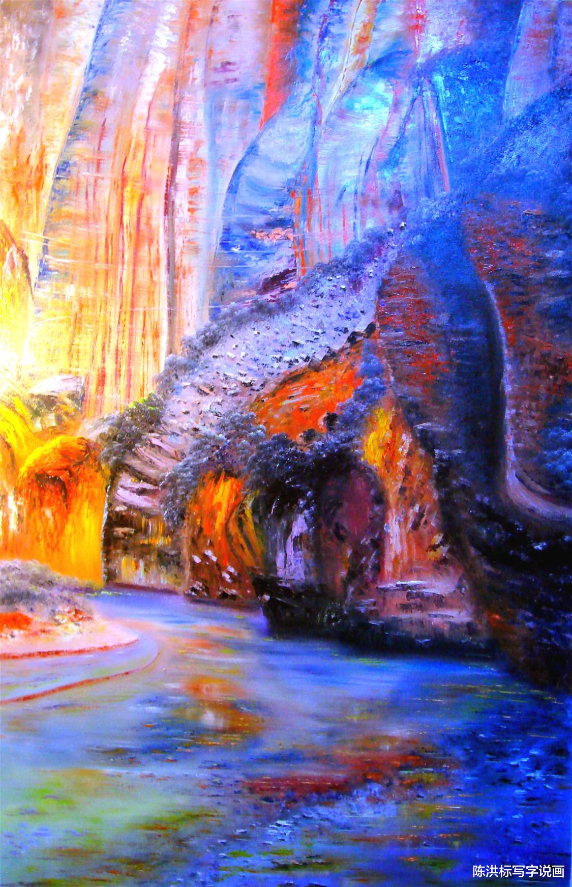 他将中国山水画的写意笔法,比如“飞白”“积墨”融入油画创作,以油彩表现《千里江山图》般的层峦叠嶂,同时保留油画色彩的丰富性。