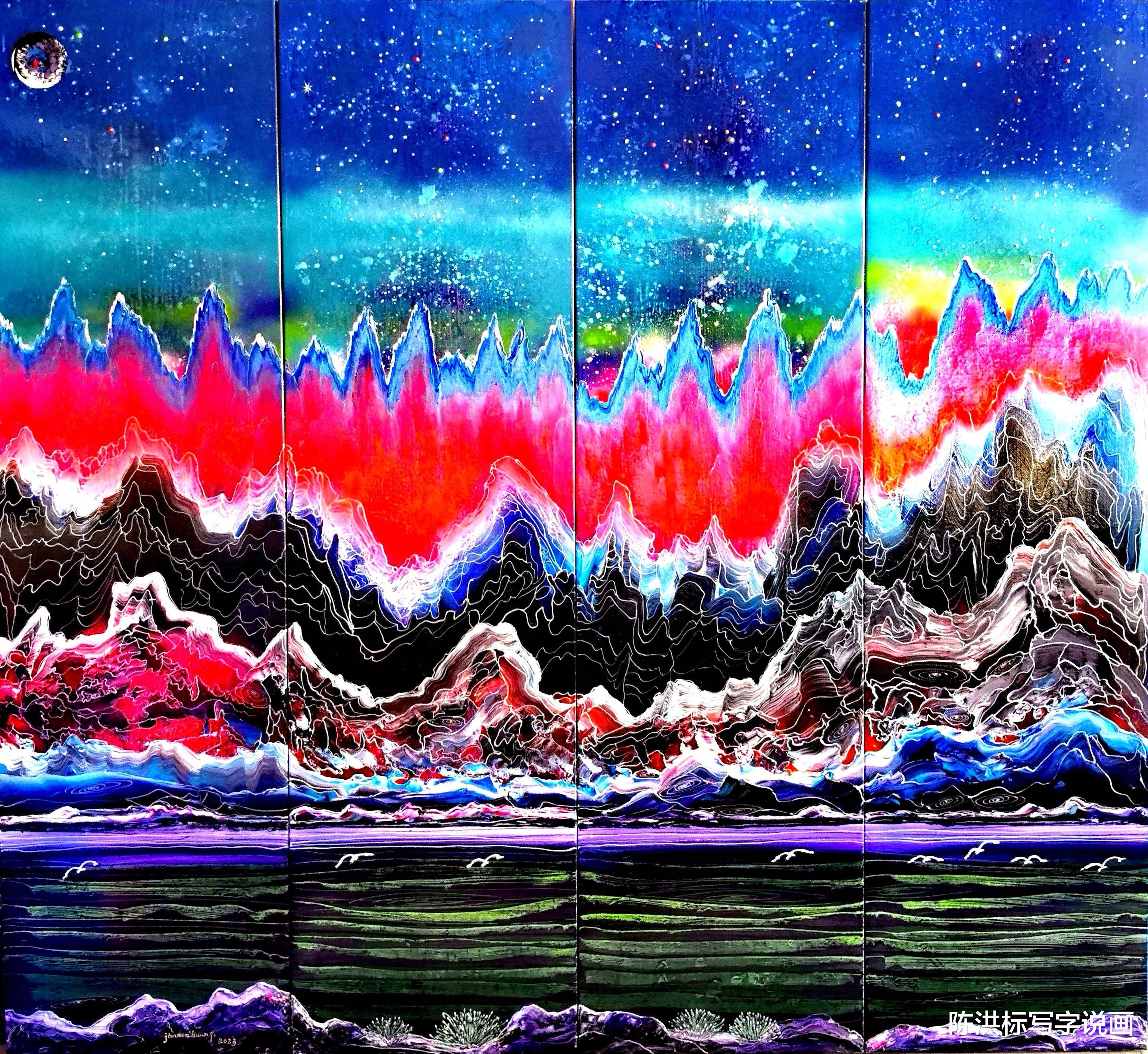 其次是作品呈现了哲学内核的现代化。作品以道家“天人合一”为核心,但摒弃传统文人画的孤寂感,转而用明快色调表现积极的生命观,比如作品《璀璨夺目》中的金色星云,契合西方对“神秘东方”的想象,又传递普世价值观。
