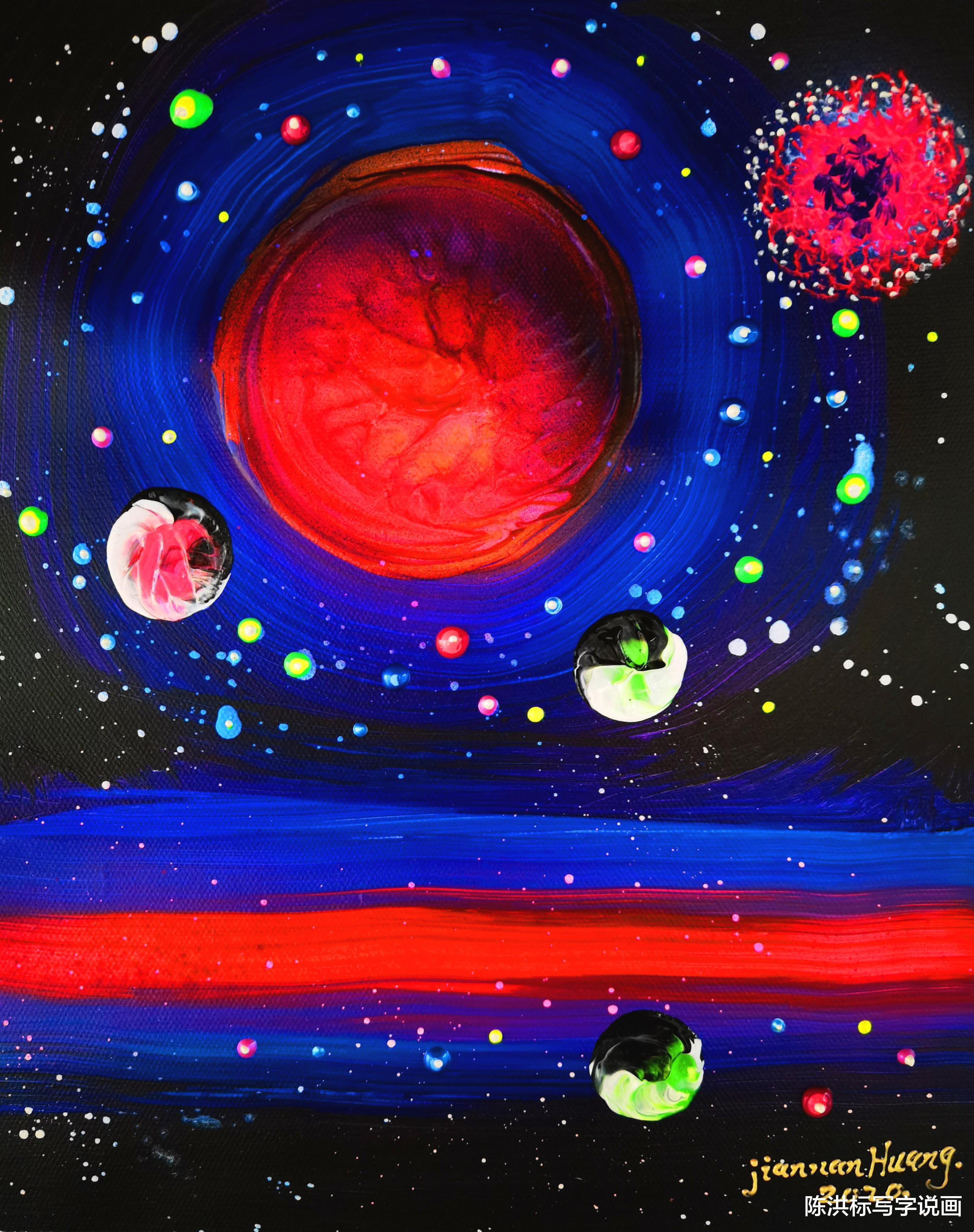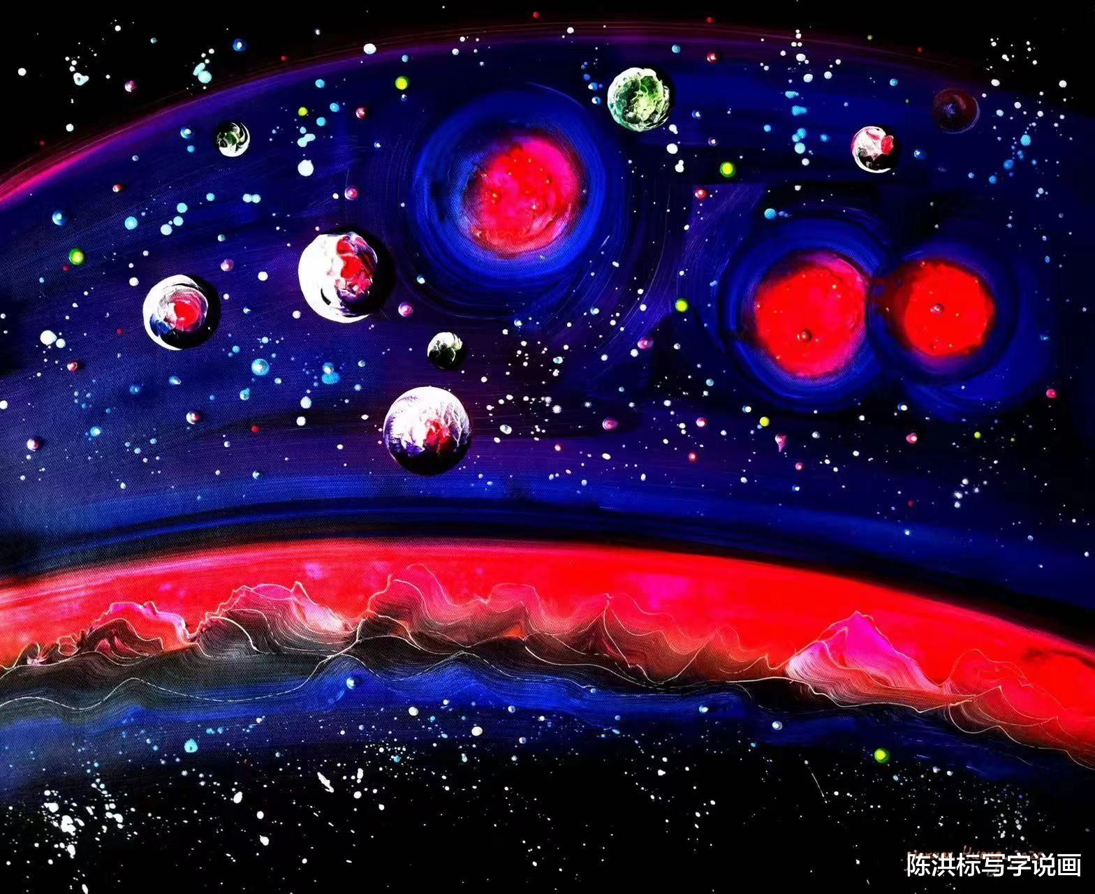与NASA合作创作《宇宙密码》系列和《星际》系列,无论是想象中的浩瀚宇宙,还是哈勃望远镜拍摄的星云图片,都通过独特的技法一一转化为绘画语言,这种“科学艺术化”路径赢得西方艺术界的追捧,被称为世界美术史上从来没有过的艺术,“创立了独特的个人综合绘画系统和新体系”。