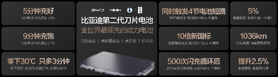 安全层面,第二代刀片电池更是以超越新国标的标准打造,通过了一系列严苛测试:500 次闪充循环后外部短路无起火、无爆炸,远超新国标 300 次快充循环的要求;热扩散测试中同时触发 4 节电池短路仍保持安全;底部撞击测试耐受最高 1500J 撞击力,全程无起火、无爆炸,彻底打消用户的安全顾虑。闪充速度、高能量密度、超长续航、长寿命、高安全,比亚迪第二代刀片电池就此成为全球领先的动力电池产品。