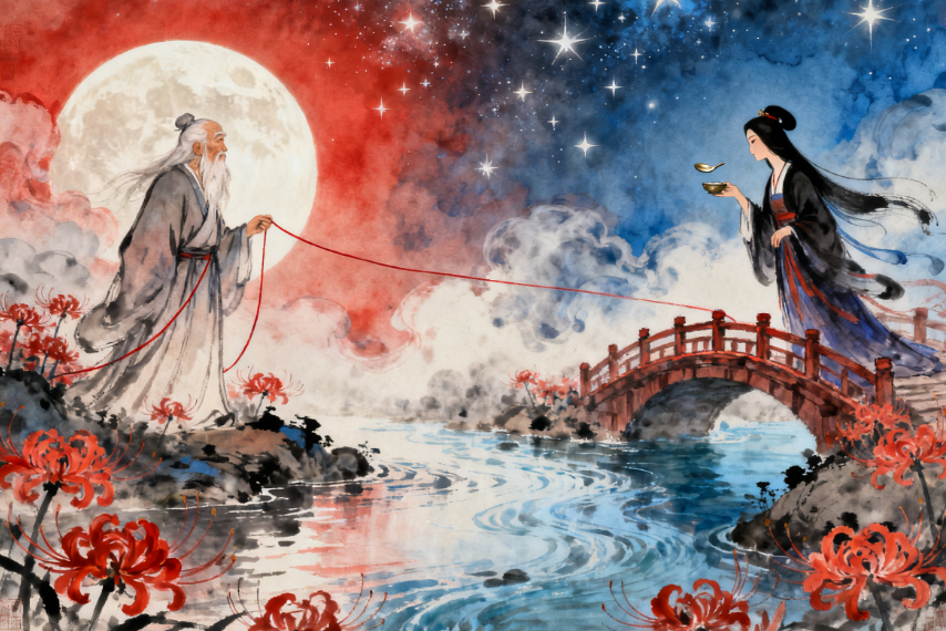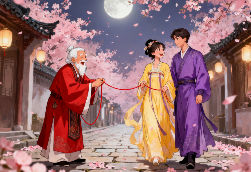 唐朝元和年间,宋城的月色格外清冽。我拄着用彼岸花枯木削成的拐杖,站在曾经的朝歌旧地,看着眼前穿红着绿的行人,忽然听见不远处传来争执声。一个白衣书生正对着媒婆怒目而视,扬言此生非城南卖菜翁的女儿不娶,哪怕对方家境贫寒、容貌平平。媒婆被怼得面红耳赤,骂他不知天高地厚。我忍不住轻笑,走上前拍了拍书生的肩膀:“少年人,莫急。你与那姑娘的姻缘,早在三百年前便已注定。”书生愣怔回头,看见我鬓发如霜、身着粗布麻衣,腰间却系着一串用红线编织的结绳,不由面露疑色。我抬手从袖中抽出一根泛红的丝线,轻轻一抛,丝线便乘风而去,隐入夜色。“明日辰时,你去城西破庙,自会见到命中之人。”后来,这书生韦固果然在破庙中偶遇了卖菜翁的女儿,多年后结为夫妻,子孙满堂。而我 “月下老人” 的名号,也随这段佳话,在人间流传了千年。没人知道,这位为世人牵线搭桥的老翁,曾是商朝的天子帝辛;更没人知道,我手中的红线,系着三千年未断的深情,连着奈何桥头那位熬汤的老妇 —— 龙吉。