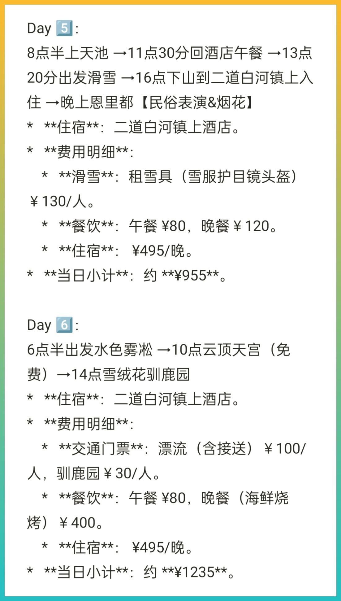 Day 4,早上6点28分的高铁。哈尔滨的晨雪刚飘起,我裹着羽绒服靠窗一路向南。窗外是白得刺眼的辽阔大地,河流都冻成了银色的绸带。到了长白山,入住蓝景温泉酒店。那天中午泡温泉时,我对朋友说:“这才是冬天该有的样子吧。”水汽缭绕,远处是雪山,近处是热气扑面——热与冷的界限在这里变得模糊又浪漫。