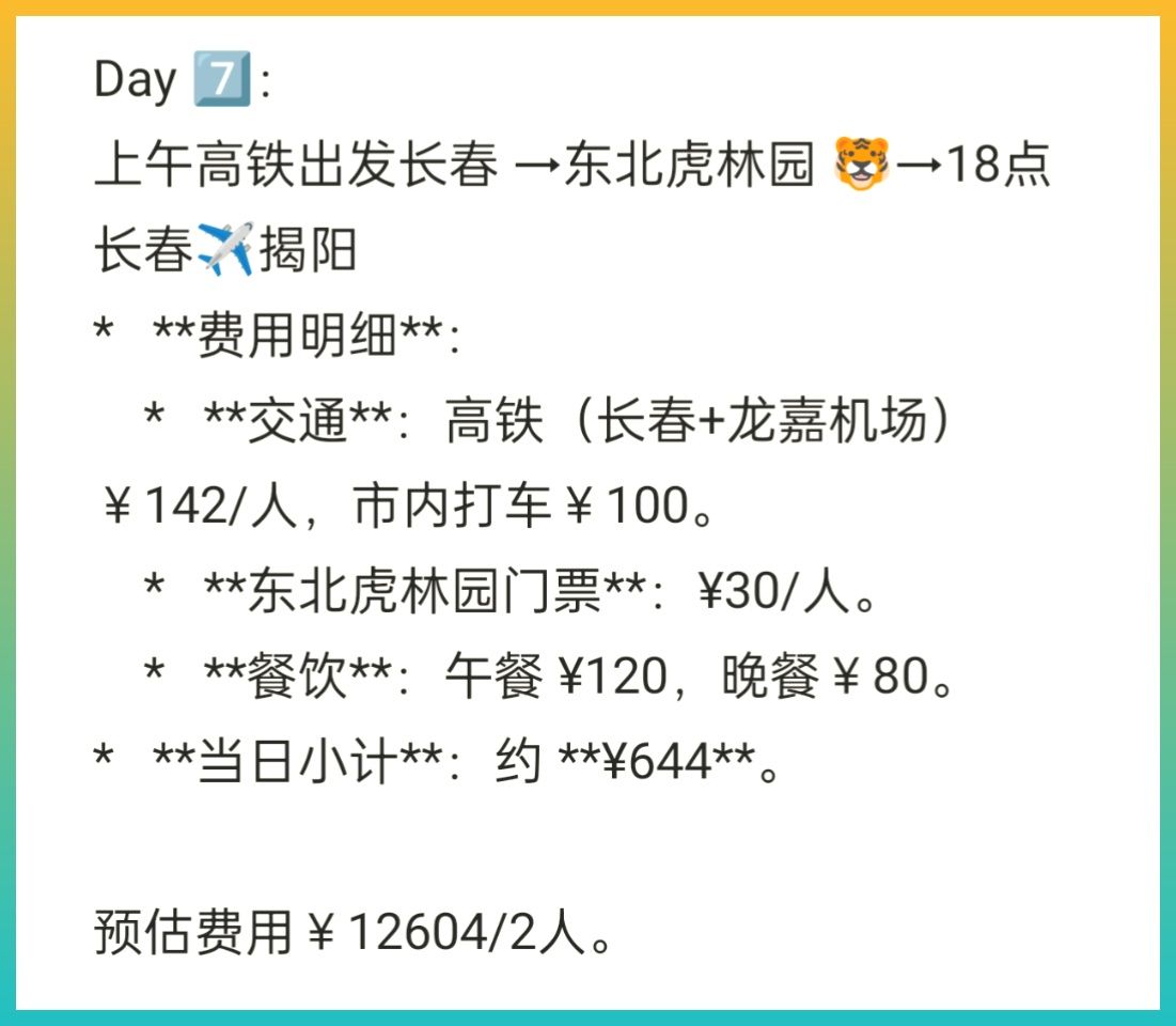 五、返程与总结|雪停了,但故事刚开始Day 7,从二道白河到长春,顺路去了东北虎园。老虎大得吓人,毛还亮闪闪。随后打包回家的特产都快堆满后备箱。回到揭阳时,行李满是雪味。算了下账,所有开销下来——12604元整,两个人刚好。预算控制算是完美收官。