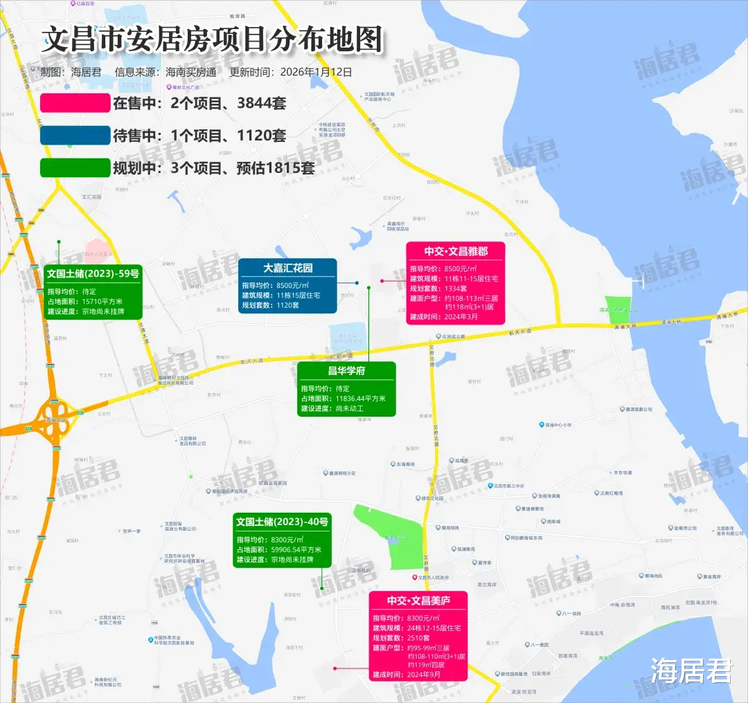 除了上述两个项目,文昌还规划建设大嘉汇花园、昌华学府两个安居房项目,都在中交文昌雅郡西侧;另外还规划两个安居房建设用地,不过没有出让。