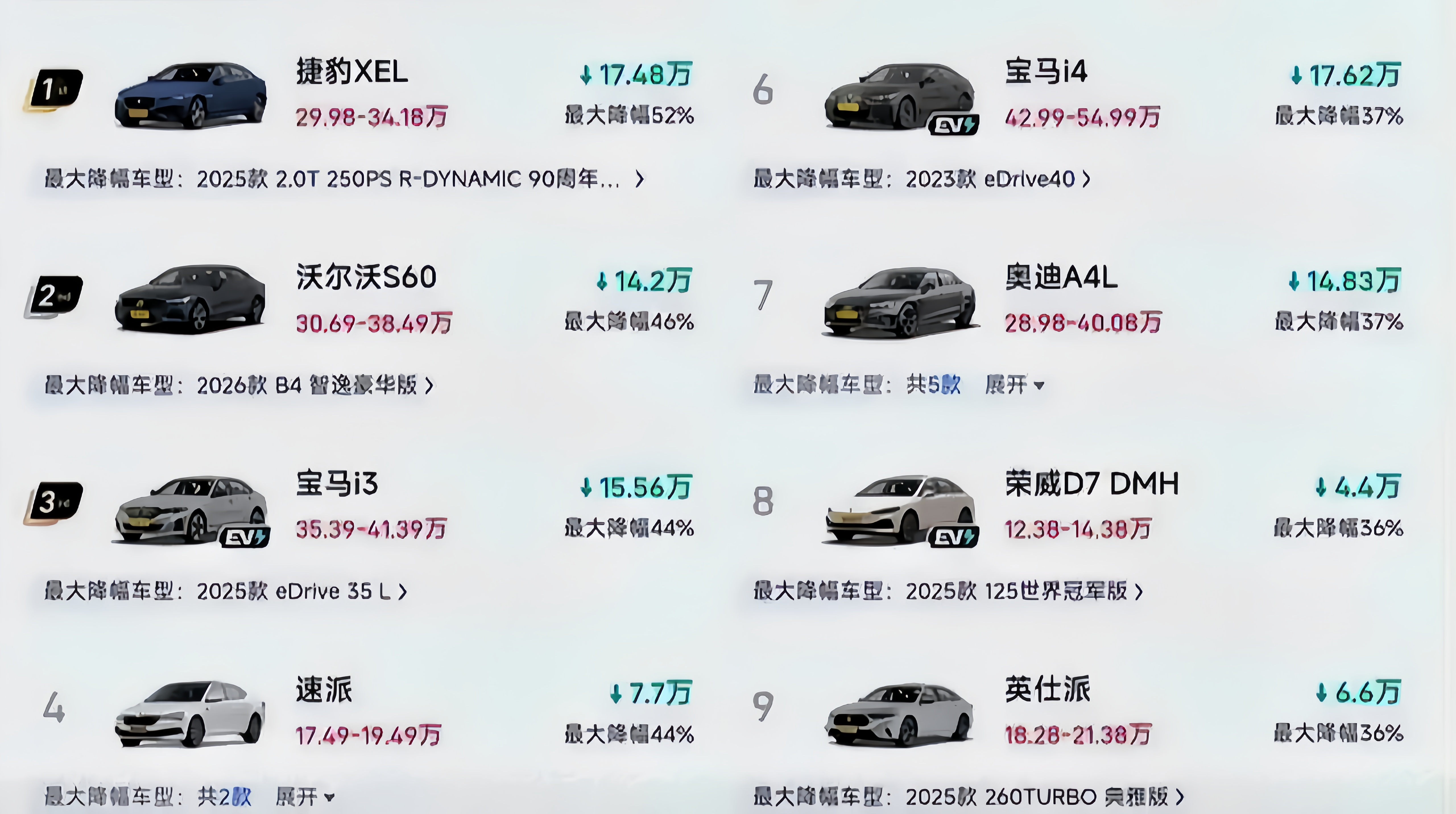 看着那张捷豹XEL直接腰斩52%的报价单,你不得不感叹,这哪里是降价,这简直就是“品牌自杀”。当年落地奔着三十万去的英伦格调,现在半价甩卖,甚至还不如一辆高配的国产A级混动车贵。沃尔沃S60也没好到哪去,六折不到的成交价,安全带都勒不住价格的下滑。