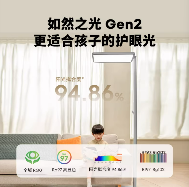 它采用紫光激发技术,精心打造出如然之光光谱,阳光拟合度高达94.86%,仿佛把清晨那缕最柔和的阳光搬进了室内。显色指数Ra达到97,色彩还原度十分出色,能让书本上的图案、文字都鲜活起来。而且,有害蓝光含量较RG0标准削减了50%,还实现了无可视频闪,统一眩光值UGR≤9.9,光线柔和不刺眼。