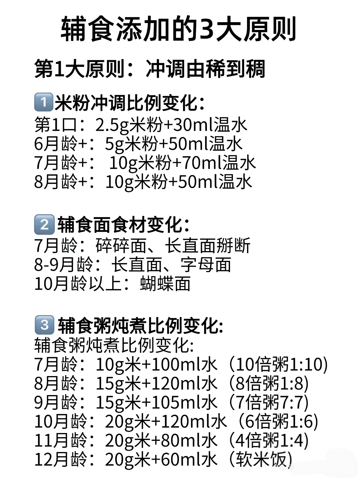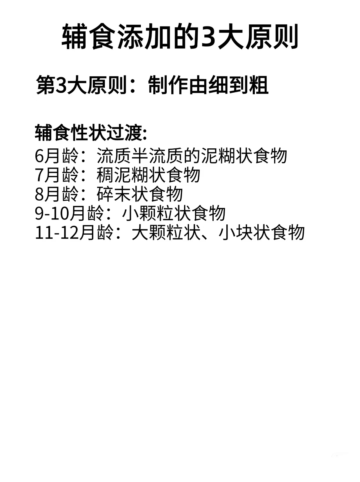 辅食添加应遵循“单一到多样、稀到稠、细到粗”的原则。记住这个顺序口诀: