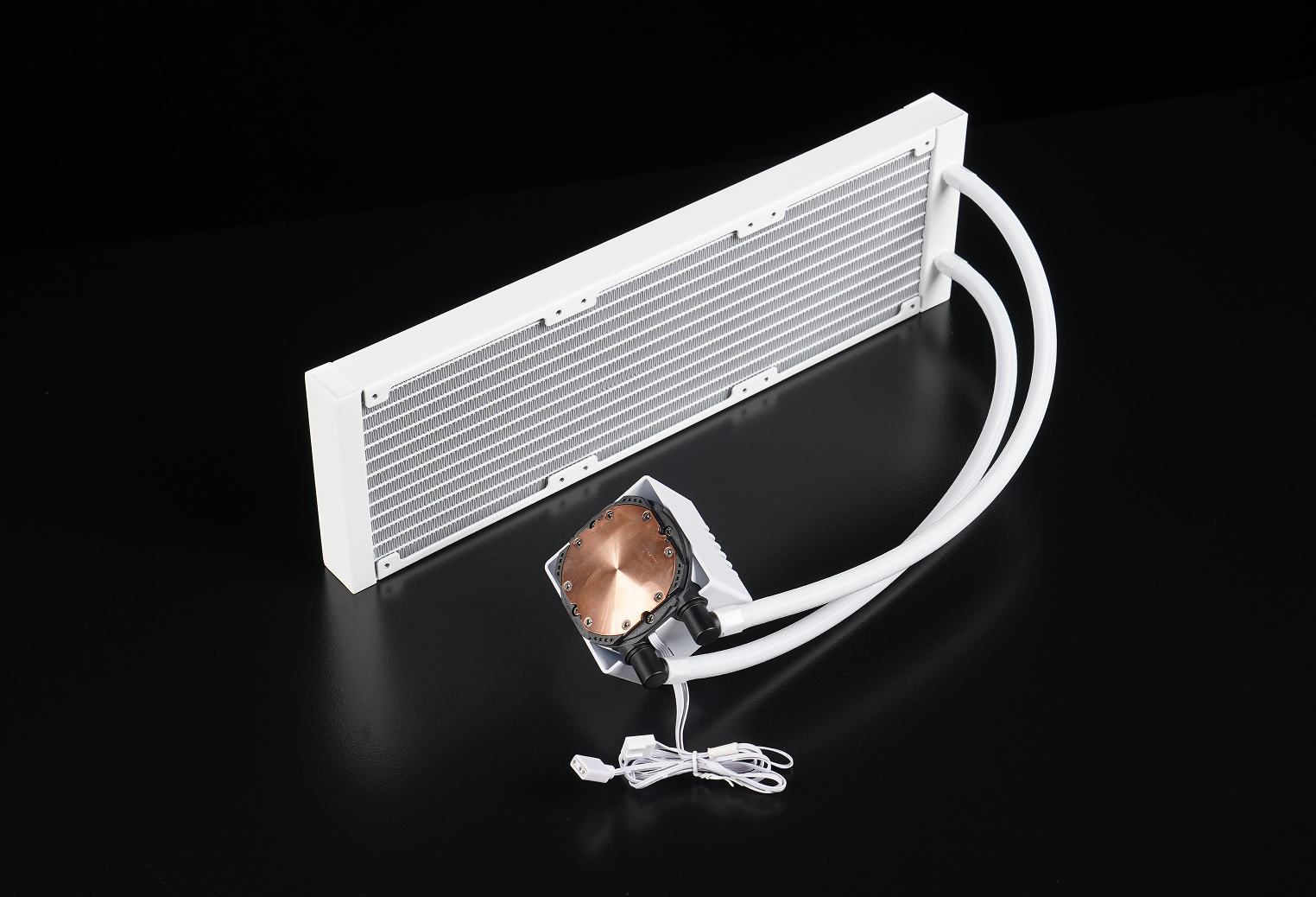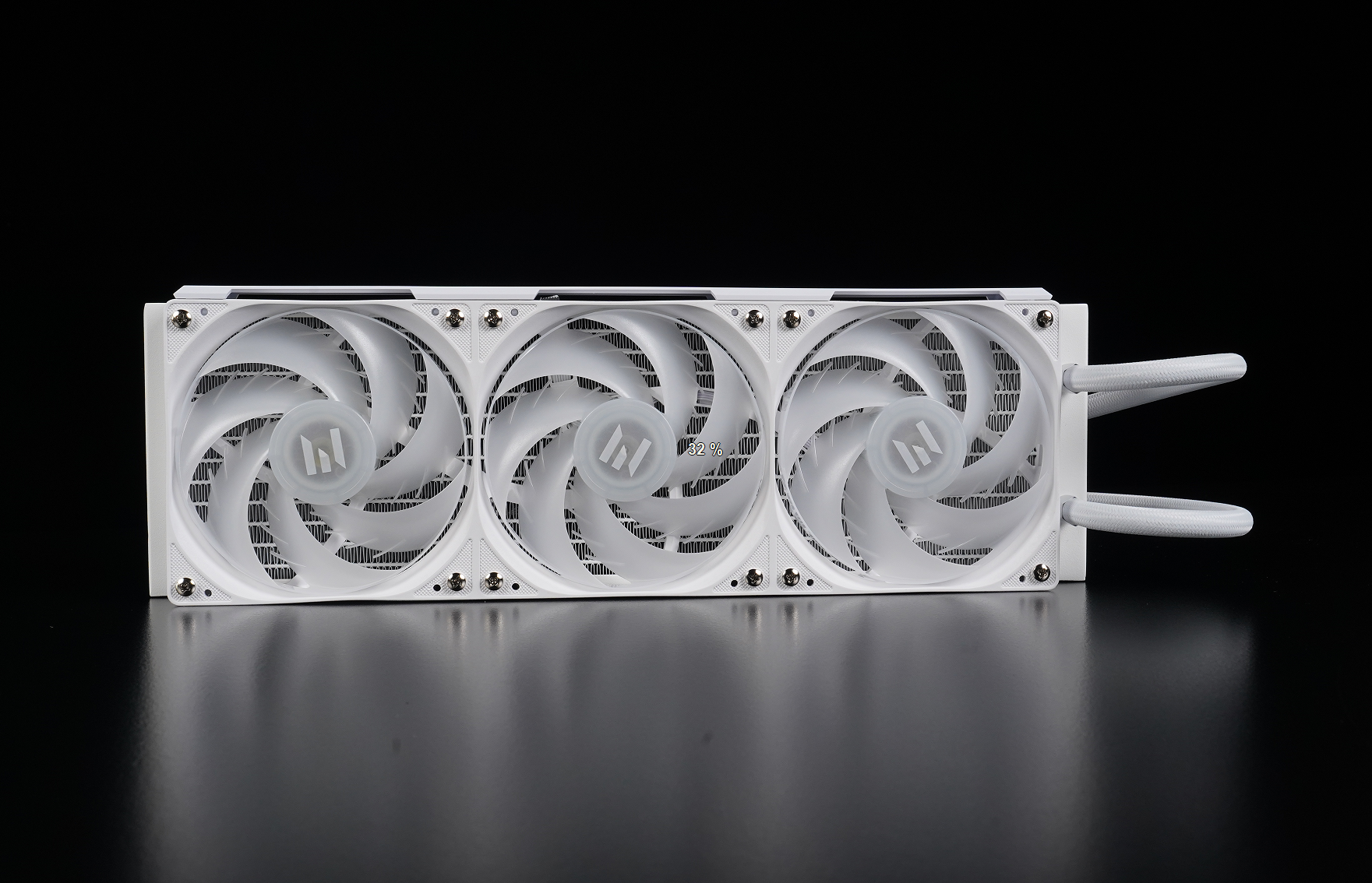先聊聊最戳我的外观设计。我入手的是纯白款,通体采用磨砂质感的白色外壳,冷排、风扇框架、水冷头都保持视觉统一性,搭配纯白机箱时浑然一体,就算是撞色搭配黑色主板或 RGB 灯带,也能成为机箱内的视觉焦点,高级感直接拉满。