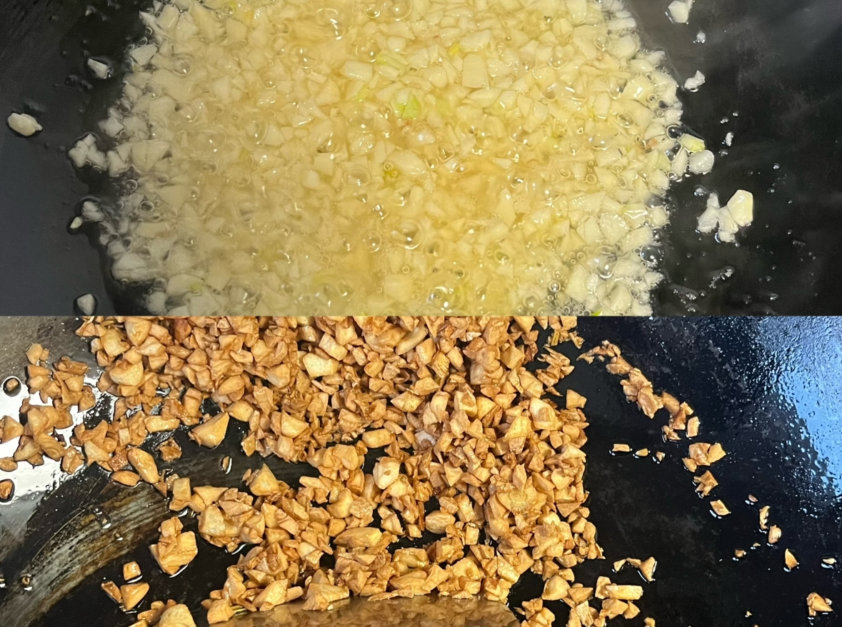 炸金蒜:锅中留底油(如果油不够可补一点),放入蒜蓉,全程小火慢炸。不停搅拌以防受热不均,直到蒜蓉变成金黄色且漂浮起来,迅速捞出控油(注意余温会让颜色加深,不要炸太黑)。