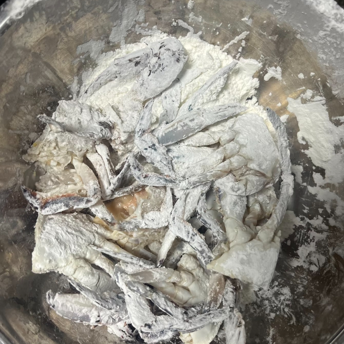 裹粉:将切好的蟹块切口处均匀沾上一层薄薄的干淀粉,防止炸的时候散开并锁住水分。