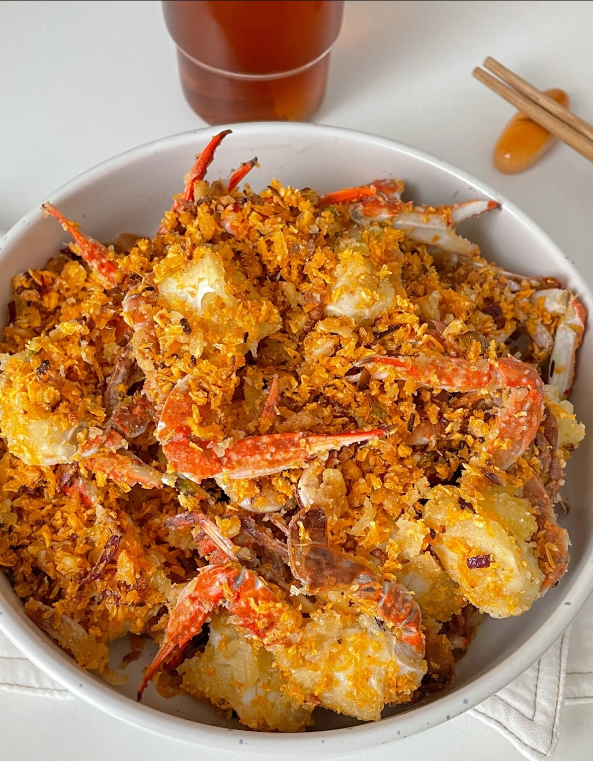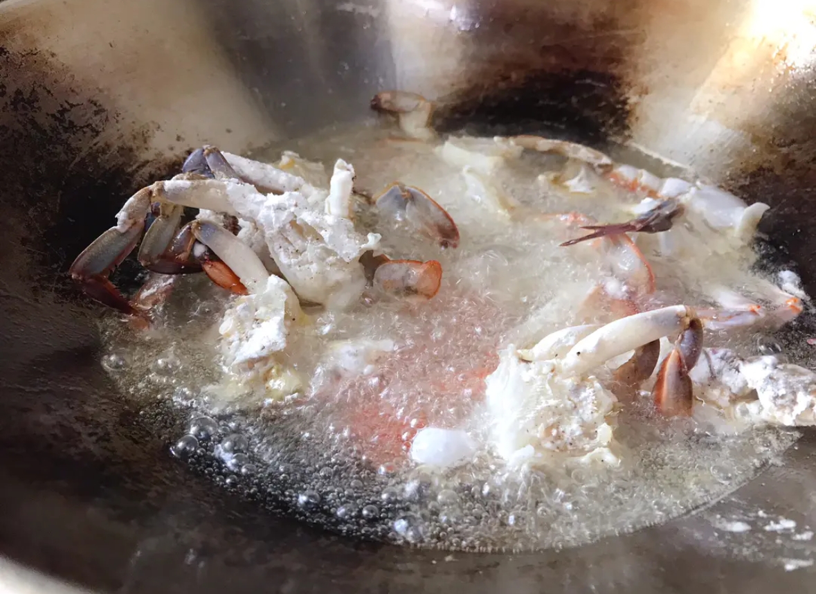 去早市挑螃蟹时,特意选了两只张牙舞爪、生猛有力的。拎回家洗净,揭开蟹盖,去除那些不能吃的腮和胃,动作熟练而从容。切块时,刀刃落在砧板上发出有节奏的“笃笃”声,在这安静的午后显得格外悦耳。不需要为了迎合谁的口味而刻意去骨,也不用担心谁嚼不动,只需按照最舒适的尺寸切好,在切口处均匀裹上一层薄薄的淀粉。这层淀粉是锁住鲜甜汁水的秘诀,也是稍后那层酥脆外壳的基础。