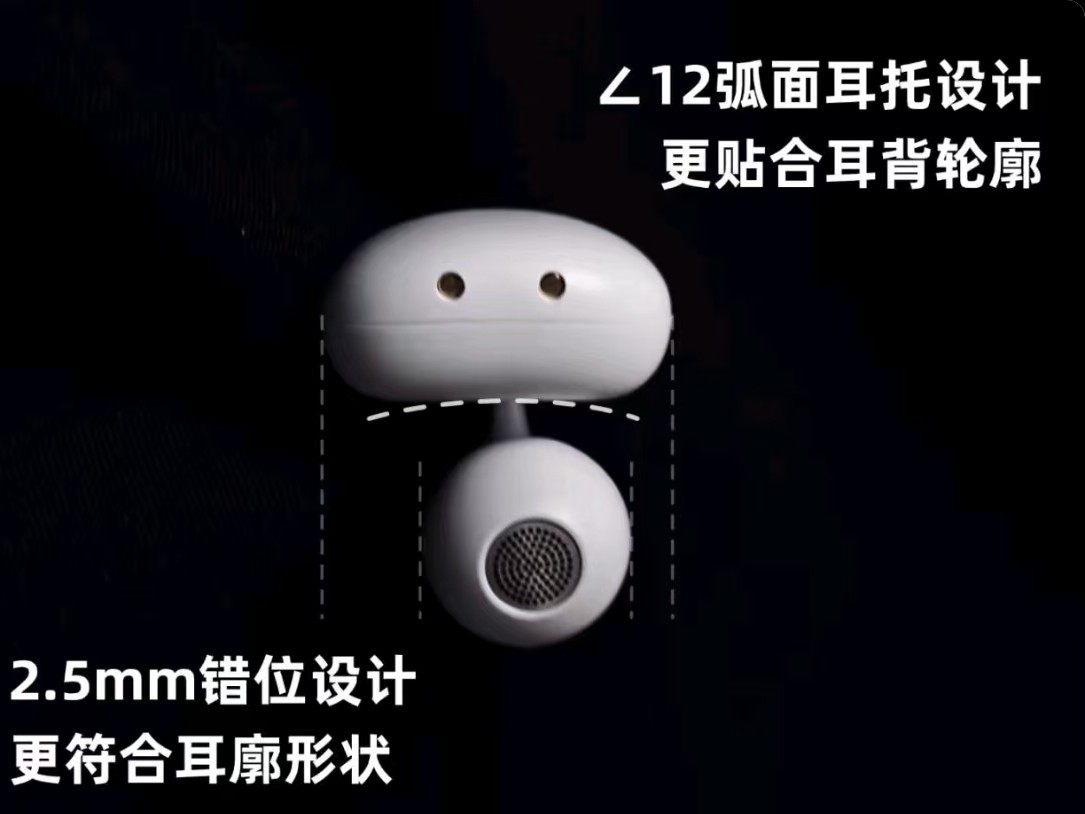 佩戴体验:耳机在佩戴设计方面很有小巧思,采用了前高后低的2.5mm错位设计,让耳机可以刚好融入耳朵形状,佩戴更稳固。同时将耳机的电池设计成了∠12弧面耳托,可以正好贴合耳朵耳背,佩戴更加贴合、舒适。单耳重量也仅有4.5g,轻盈不压耳。