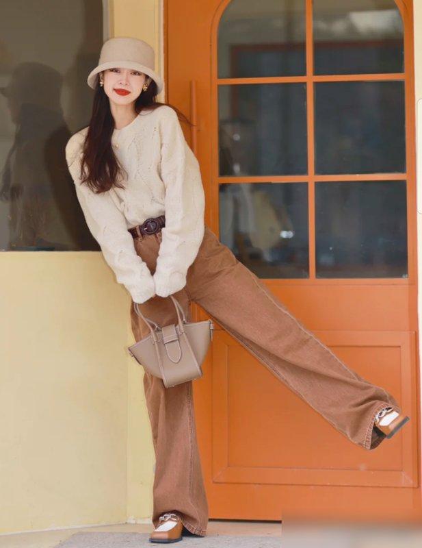 记住“材质配对”就行:垂感好的针织/毛呢阔腿裤,一定要搭尖头平底鞋!