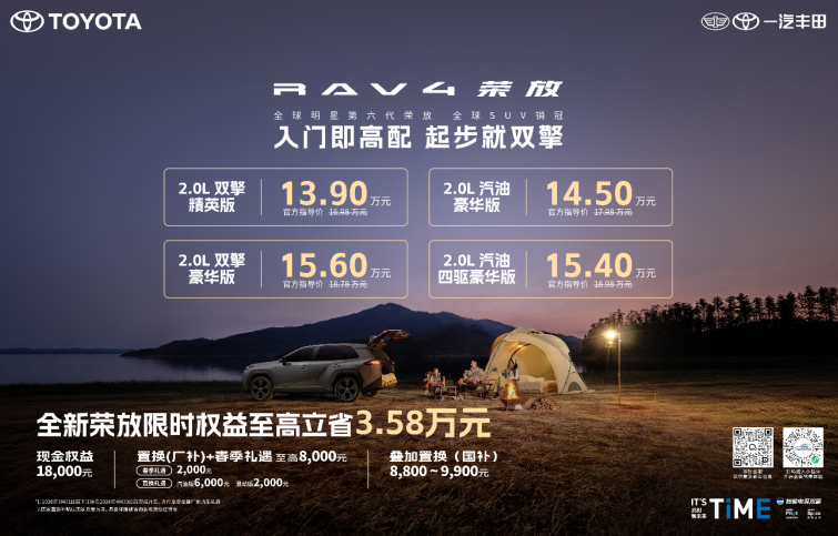 惊喜不止于价格,还有重重福利。2026年3月31日前下订荣放全系并在4月30日前开具发票的用户,即可享受一汽丰田提供的包括春季礼遇和置换补贴在内的至高8000元春日礼。这还不够,用户还可同步享受至高约万元的国家补贴。