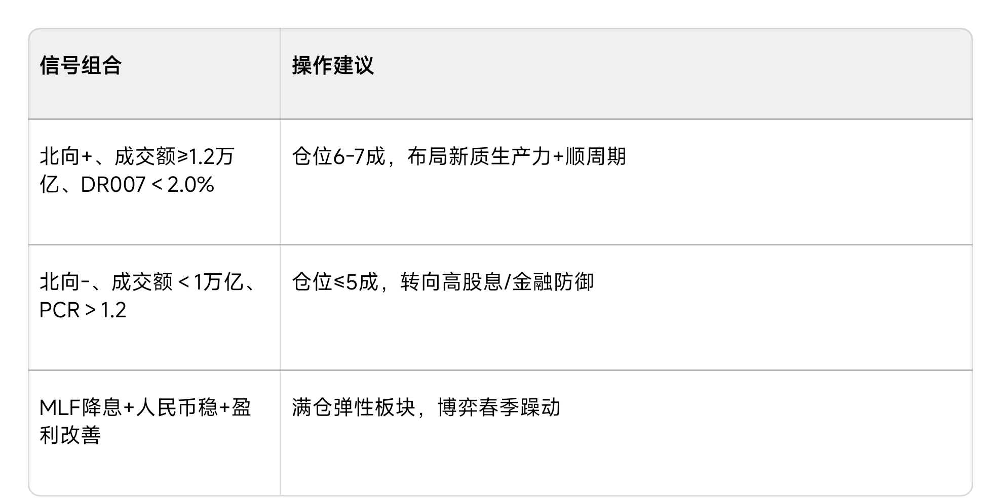- MLF操作(月度):净投放≥1000亿(如12月净投放1000亿)为宽松信号;中标利率下调(当前2.5%)属强催化 。