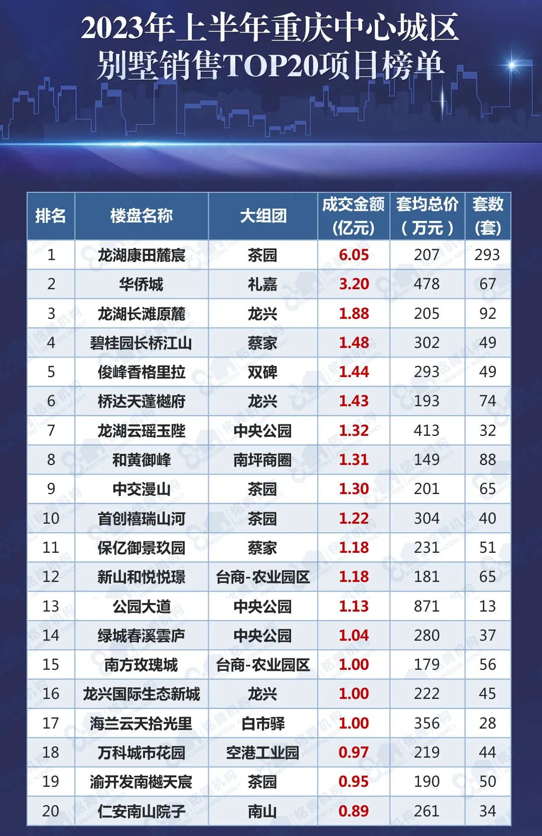 6、2023年上半年重庆市中心城区别墅销售TOP20项目榜单