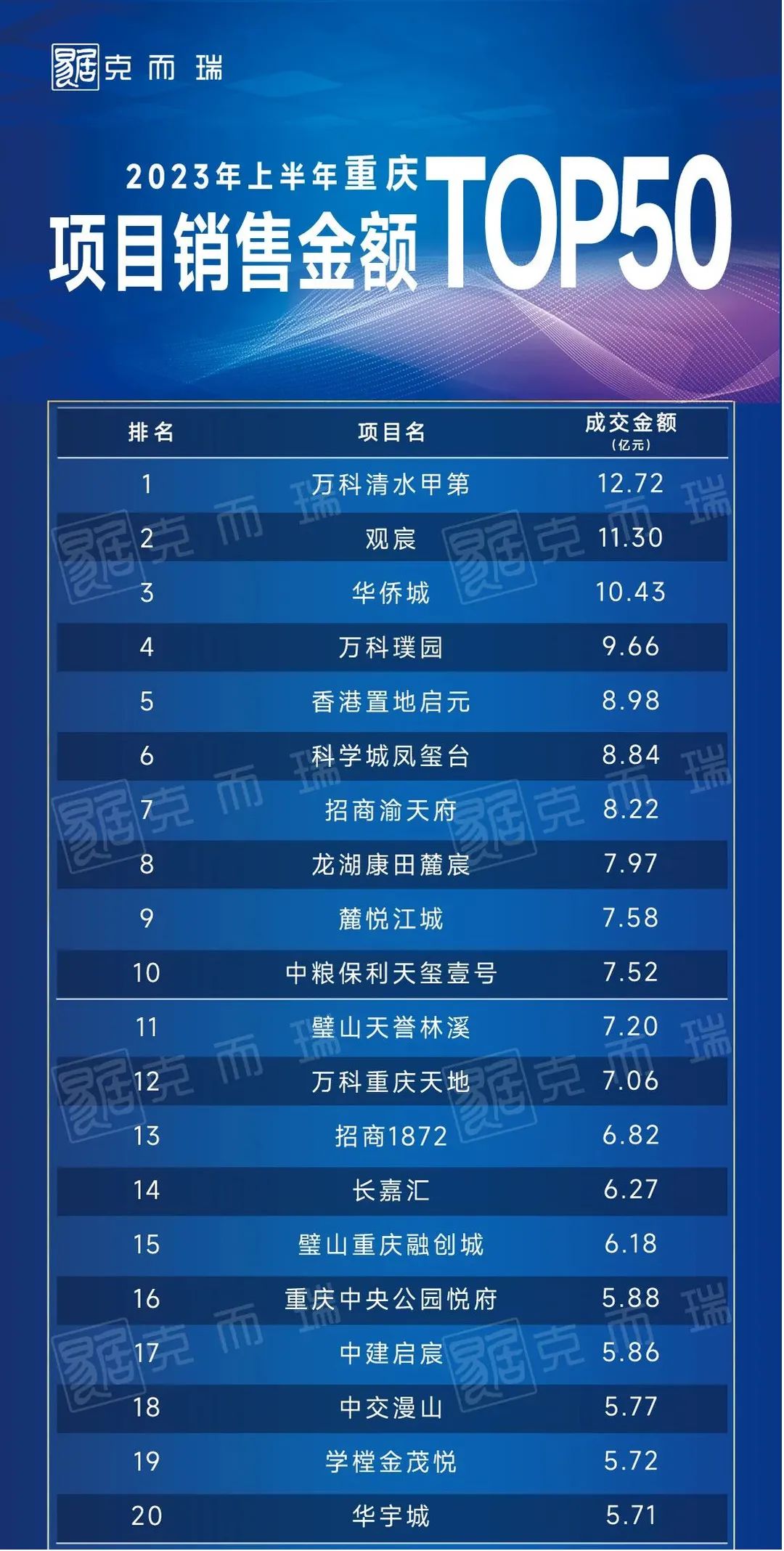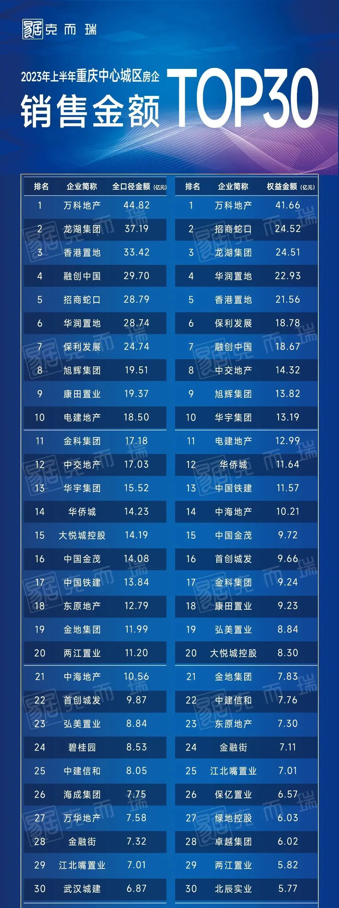 1、2023年上半年重庆房企金额榜单TOP20: