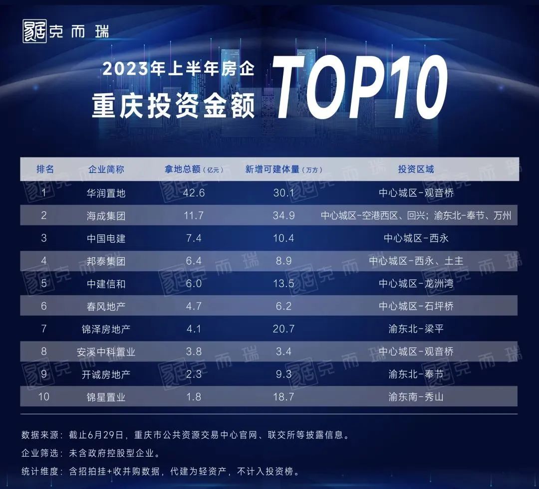 就主城的拿地情况来看的话没有很大的亮点,唯一的亮点就是华润拿下观音桥地块了,其他的都是些小角色。不过在市场艰难的时候也有一些企业加码项目或者进入主城,比如说海成,虽然部分项目陷入舆论,但是在今年上半年强势拿地,比央企还大方,投资空港西区、回兴,非常积极。