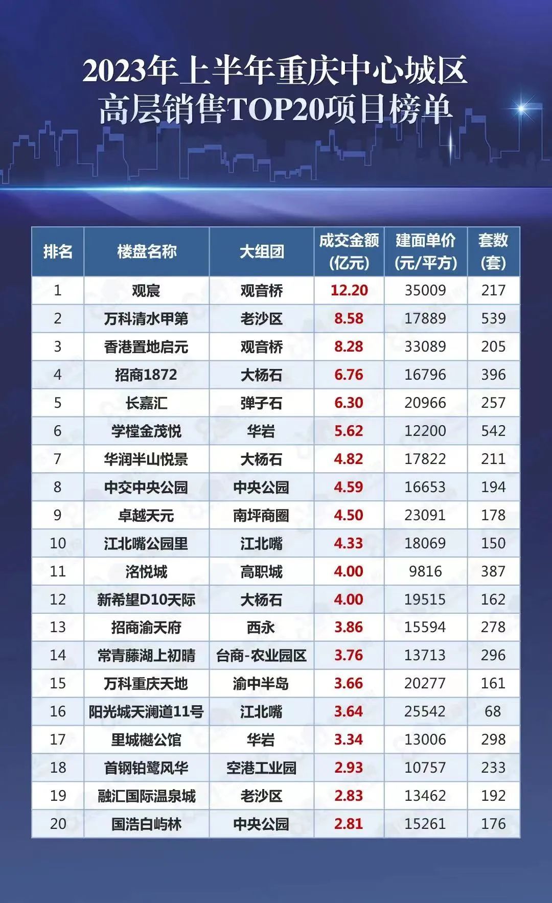 4、2023年上半年重庆市中心城区高层销售TOP20项目榜单