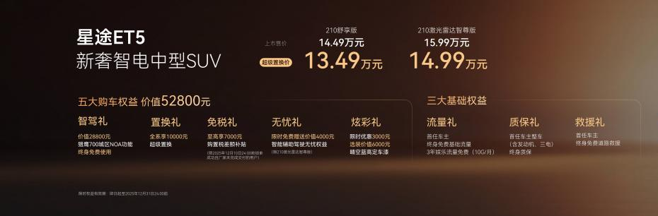 11月28日,在坐拥粤港澳大湾区核心区位的世界级城市珠海,星途汽车正式发布“新奢智电中型SUV”星途ET5。新车共推出210舒享版、210激光雷达智尊版两款配置,官方指导价14.49万元-15.99万元,超级置换价13.49万元-14.99万元以诚意满满的价格回馈用户,并重磅宣布猎鹰700城区NOA功能终身免费使用。价值52800元五大购车权益、三大基础权益下定即享。